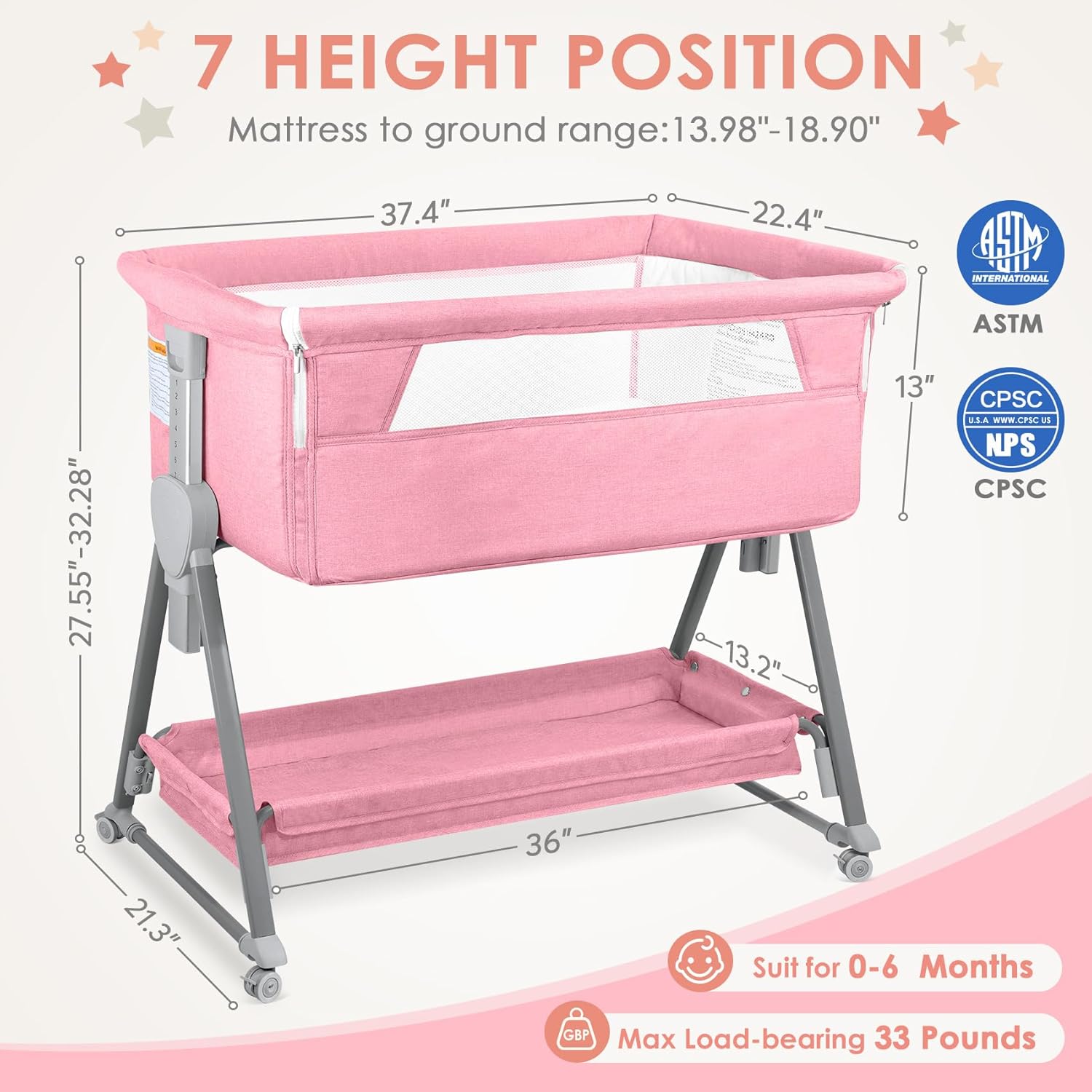 7 Adjustable Heights & Single-sided Angle: BIERUM Bedside bassinet features scientific seven gear adjustment levels(14-18.9 inches from bassinet mattress to the ground). Not only limited to the bedside, but also suitable for all kinds of sofas, or other places. This will make it easier for you to care for your baby, even in the middle of the night. The newborn bedside crib also has a practical design. After feeding the baby, you can adjust the angle to prevent the baby from spitting milk.