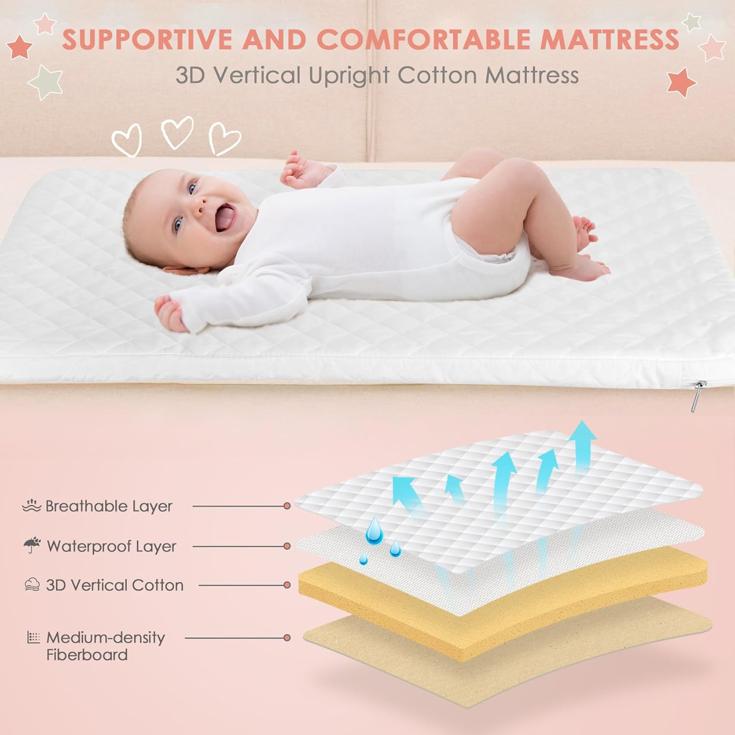 3 in 1 Baby Bassinet: BIERUM baby bedside bassinet can be used as a side-down baby bed, bedside sleeper, or stand-alone baby crib. This bassinet bedside sleeper comes with a spacious extra-thick mattress(33″ L x 19.88″ W x 1.18″ H). The mattress composed of high-density memory foam is soft for baby sleeping, including a waterproof & breathable sheet for easy cleaning. The scientific design provided all-around support and protection for your baby’s spine. Allow the baby to have a nice sleep.