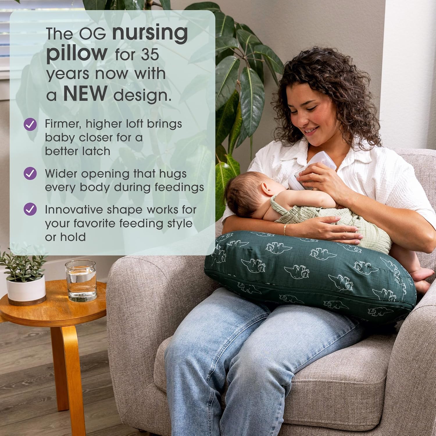 Introducing the Updated Boppy Nursing Pillow, your comfy, snuggly sidekick for feeding moments. This redesigned cutie, dreamed up by clever moms, gives your arms and back a break while keeping baby at the perfect angle for breastfeeding and bottle feeding. Did you know the average nursing mom clocks over 35 hours a week feeding? Talk about a full-time job. But fear not, our Redesigned Boppy Nursing Pillow is here to save the day (and night), just as our Original Boppy Nursing Pillow has done for 35 years. With its updated, versatile design, you can cradle, cross cradle, or football hold with ease. This pillow’s got your back (literally) with its larger, firmer shape that hugs every body type just right, keeping baby snug and positioned just right. It’s small enough to fit in your rocking chair or glider but big enough to deliver all the support you need. No wonder it’s been a registry must-have and a favorite among moms, dads, caregivers and lactation consultants alike for over three decades. The easy-on, easy-off, beltless design has a wider opening and means you can pop it on with one hand—because what mom or dad has two free hands? Plus, its removable cover is machine washable for those inevitable messes. Filled with hypoallergenic, recycled fiber, it’s as carefree as it is cozy. Got a laundry day? No worries. We’ve got extra covers so you can always have a fresh one ready. Just remember, this pillow is for supervised awake-time only—no snoozing allowed! Trust Boppy to keep you and your baby comfy, happy, and oh-so-confident. Let’s make feeding time the best time.