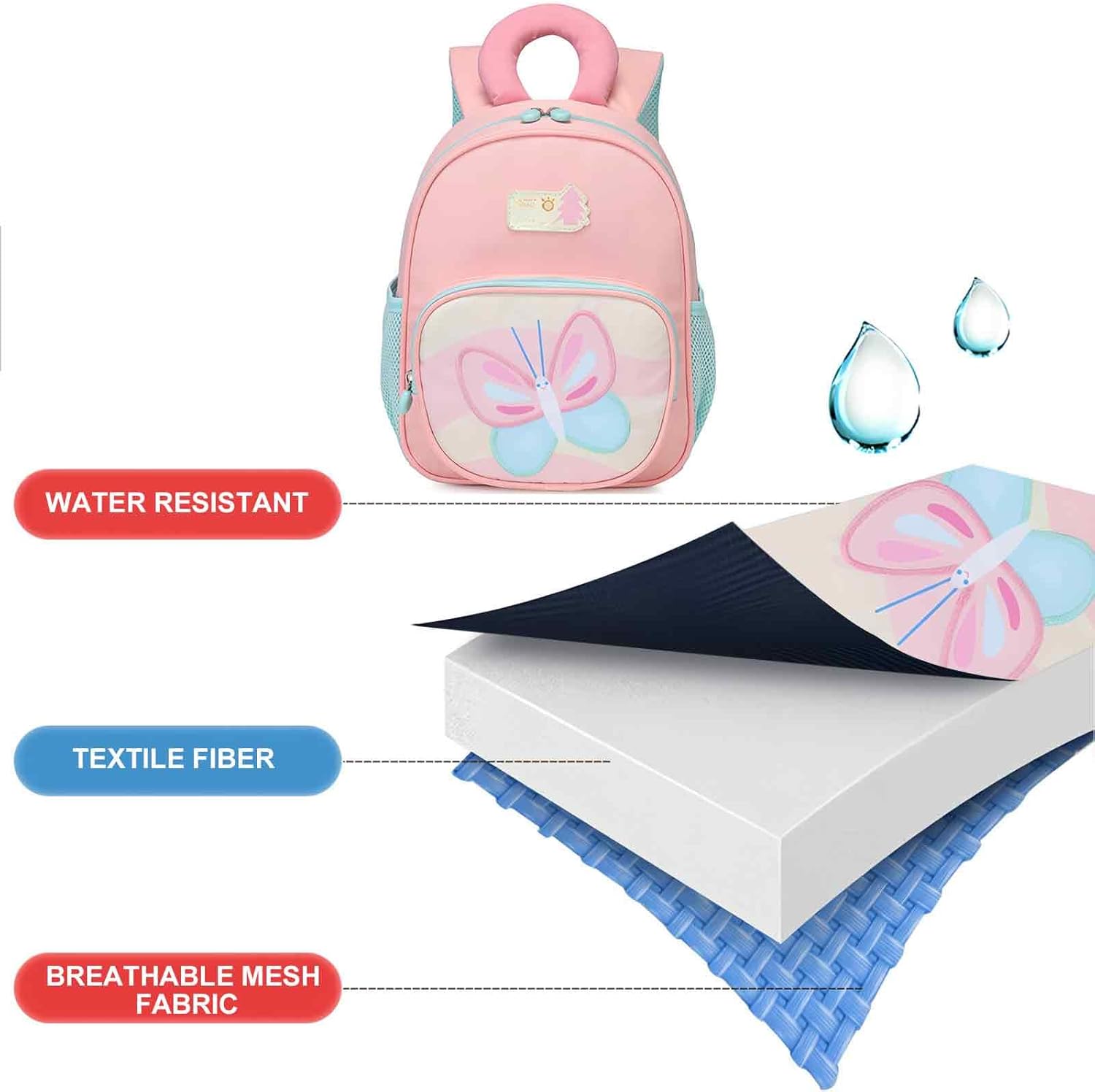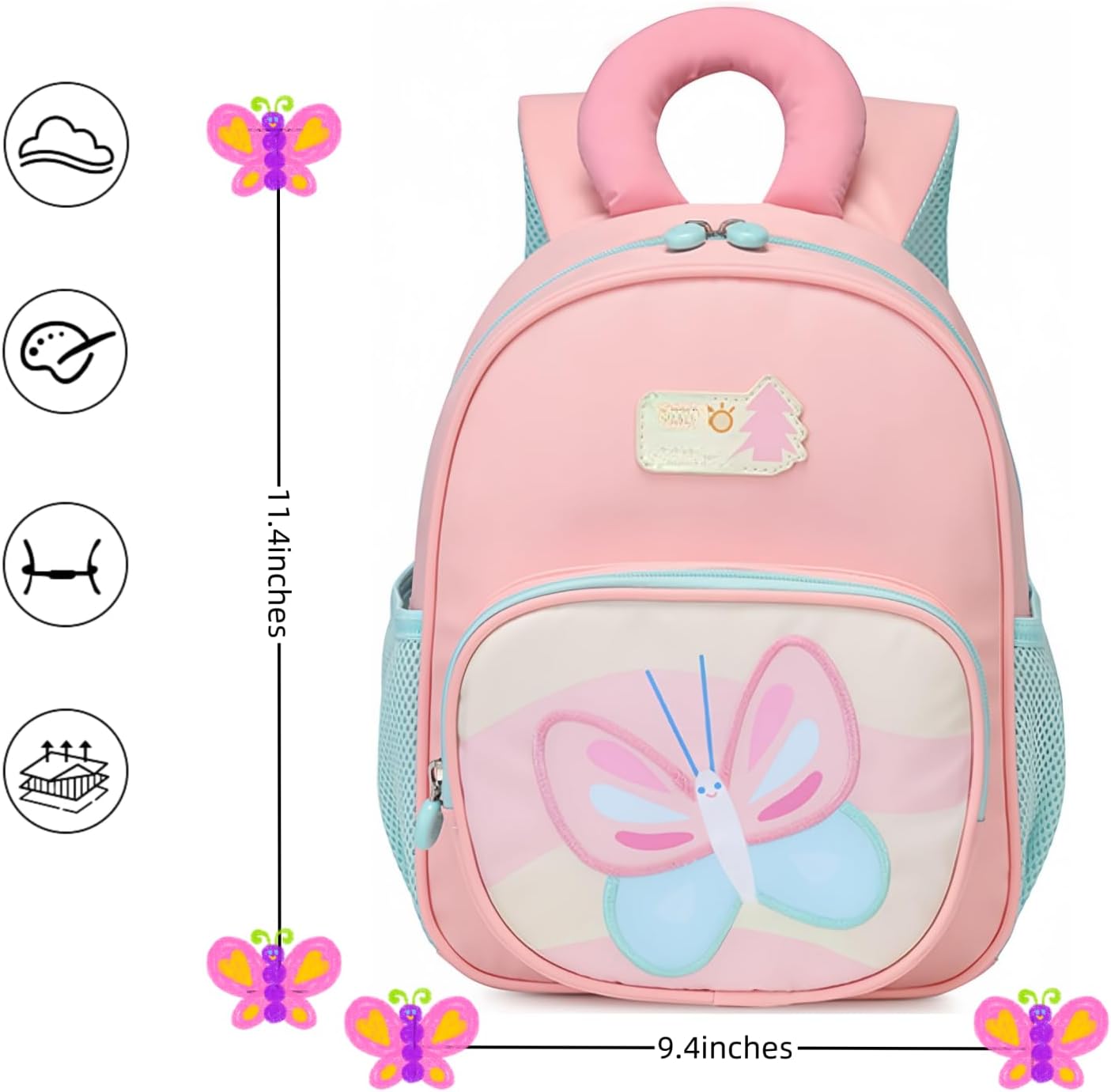 This toddler backpack is suitable for boys/girls aged 2-4 and comes with padded shoulder straps and smooth zippers which solves the problem that the zipper is too stuck for little kids to open. Water-resistant and easy clean. Don’t worry about kids getting wet or dirtying the backpack.