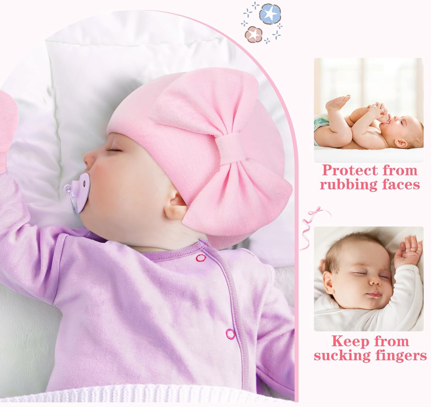 NEWBORN SET: These knit baby hats and mittens sets are specially designed for baby’s delicate skin. It’s soft, warm, comfortable and will not cause pressure on your baby’s head while keeping warm. HAT AND MITTEN: Made of soft, lightweight, breathable and warm fabric. These soft baby hat and mittens whth elastic that easy to put on and take off, and won’t make the baby feel too tight or too loose. These newborn mittens also can keep warm and prevent the baby from self scratching. NEWBORN HEADBANS: This newborn beanie with a big cute bow design, makes your baby become more fashionable and cute. This newborn hats for boys and girls can also be worn as a night cap which helps keep the baby warm, as well as reduce rubbing on the head when moving around during sleep. BEST GIFT: Fashion baby girl hats are easy to pair with any newborn outfits and suitable for hospital, birthday, party, photo shoots or daily wear. This newborn beanie will be a great gift for baby when they were just born or on various festivals. SIZE: This baby hat with bow has two size, suitable for 0-6 Months baby girls and boys. 0-3 Months: Hat height is 5.5″, hat circumference is about 11.8″. 3-6 Months: Hat height is 5.9″, hat circumference is about 13.4″.