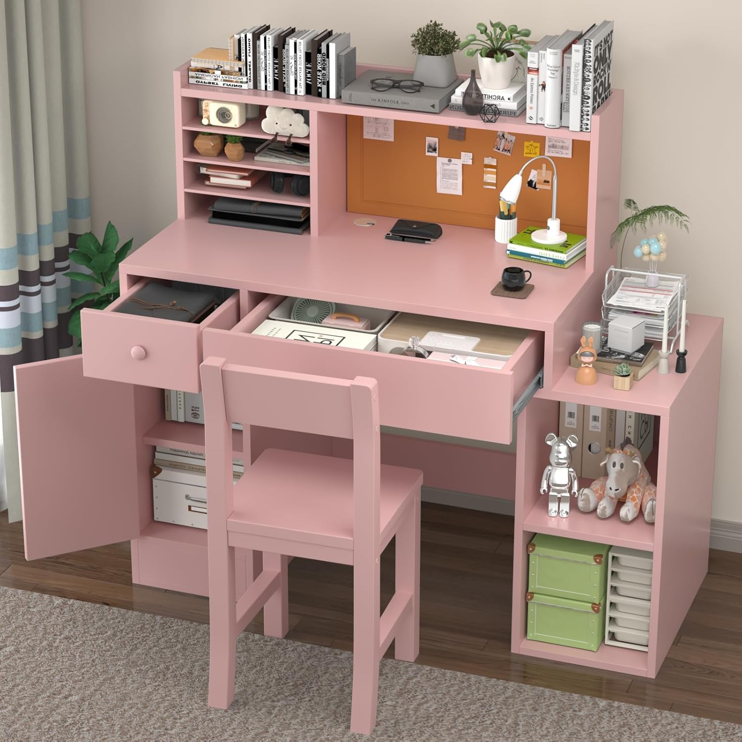 Our Study Desk Childrens with Bulletin Board, with Chair, Drawers and Cabinet offers a perfect place for working on art projects or finishing up their homework. The multiple storage options also help keep bedrooms tidy and organized, which mom and dad are sure to love. Features include. The desk offers you ample space to keep books, documents,and other things, suitable for adults and children.
