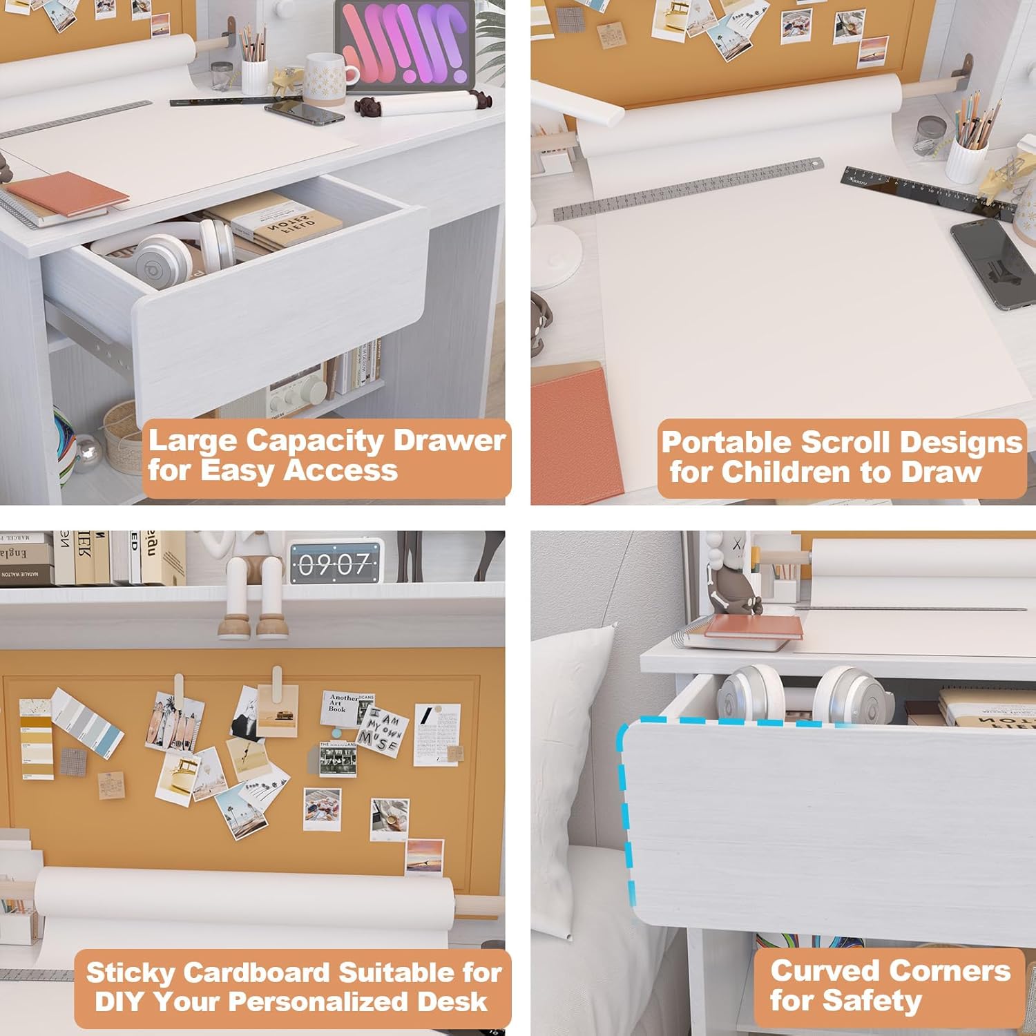 【CUBBIES CORKBOARD AND MORE 】: This kid’s desk and chair set comes with a clipboard, a cabinet, and two drawers, The desk offers you ample space to keep books, documents, and other things. Above Desktop with Wooden Paper Roll Dispenser, suitable for children Drawing.-4pCOSc