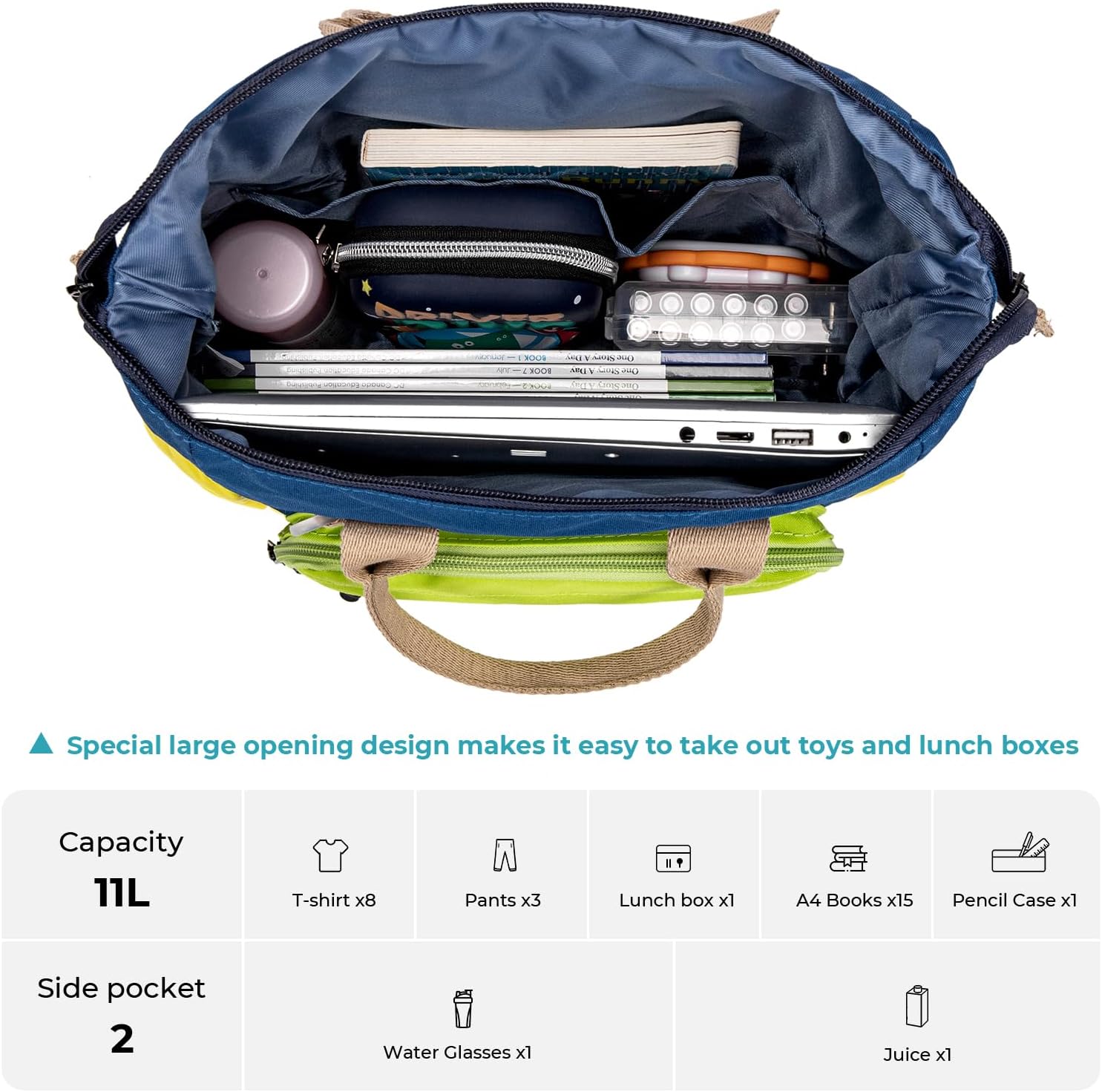 Lightweight & Spacious:This preschool kindergarten backpack measures at 11 x 4.5 x 13 inch, weights:0.86lb/0.39kg. The toddler boy backpack has 1 main compartment,1 front compartment and 2 side pockets for childs to put items such as school supplies,milk,toys,mini ipad,food, side pockets can hold umbrellas and water bottles. This cute toddler backpack is suitable for preschool and kindergarten girls and boys.