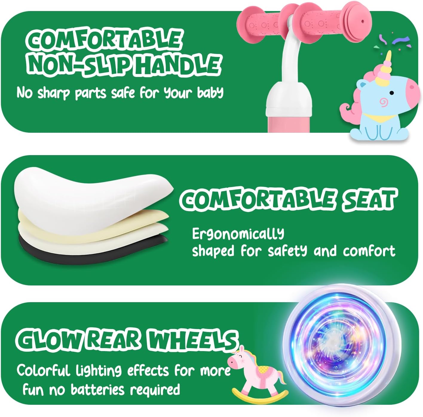 【Enchanting Colorful Light-Up Wheels】Our toddler balance bike features specially designed rear wheels that light up in vibrant colors, captivating your child’s interest and making every ride magical. The lights require no batteries—just the simple motion of the wheels! This engaging feature turns the balance bike into the perfect first birthday gift for 1-year-olds, adding extra fun to their playtime.