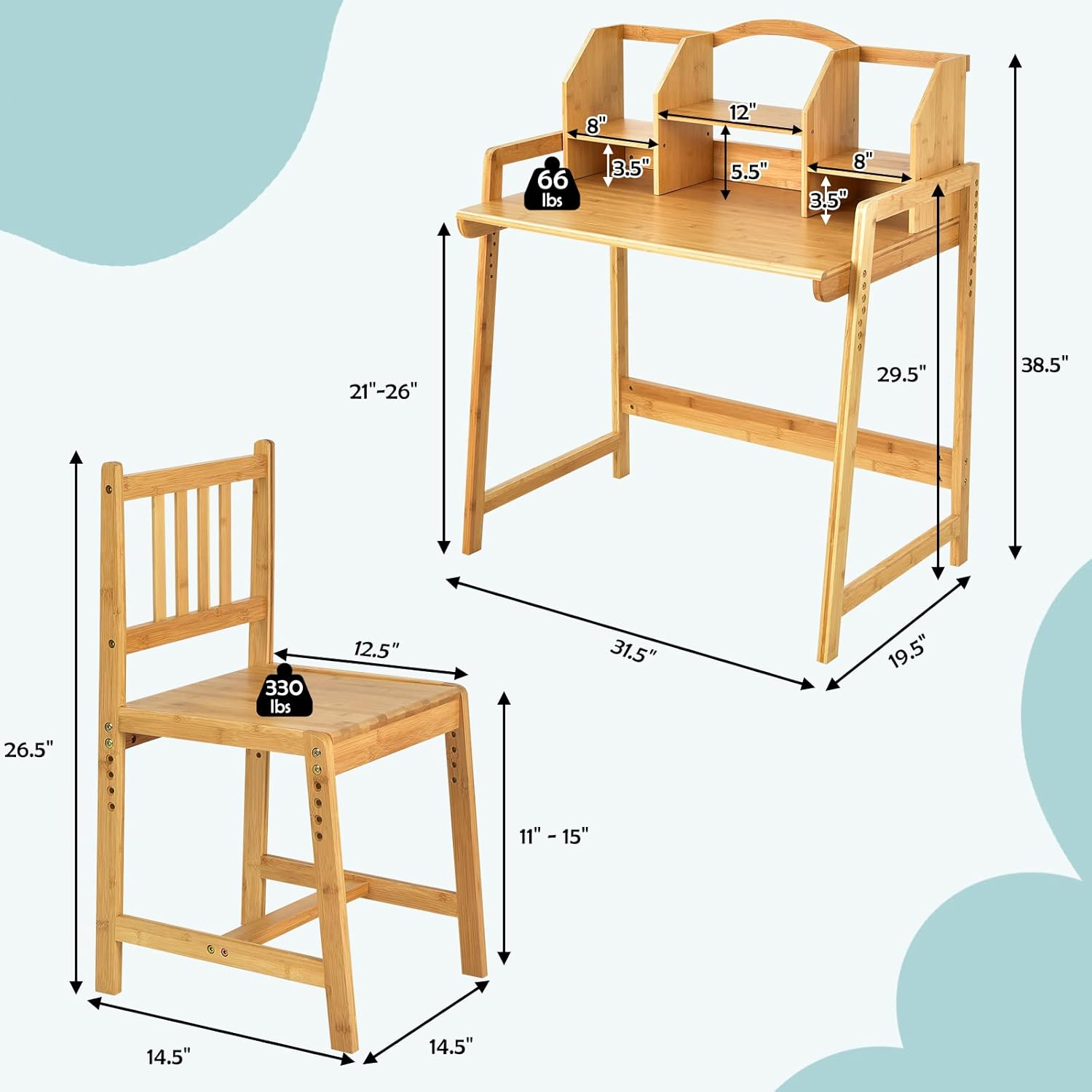 Selected Bamboo Material: Crafted from 100% natural and solid bamboo material with exquisite workmanship, this kids study desk and chair set is safe, non-toxic and has high deformation resistance for a long lifespan. The reinforced bottom structure enhances the overall stability and load-bearing capacity. Max weight capacity of the desk/chair: 66lbs/330 lbs.
