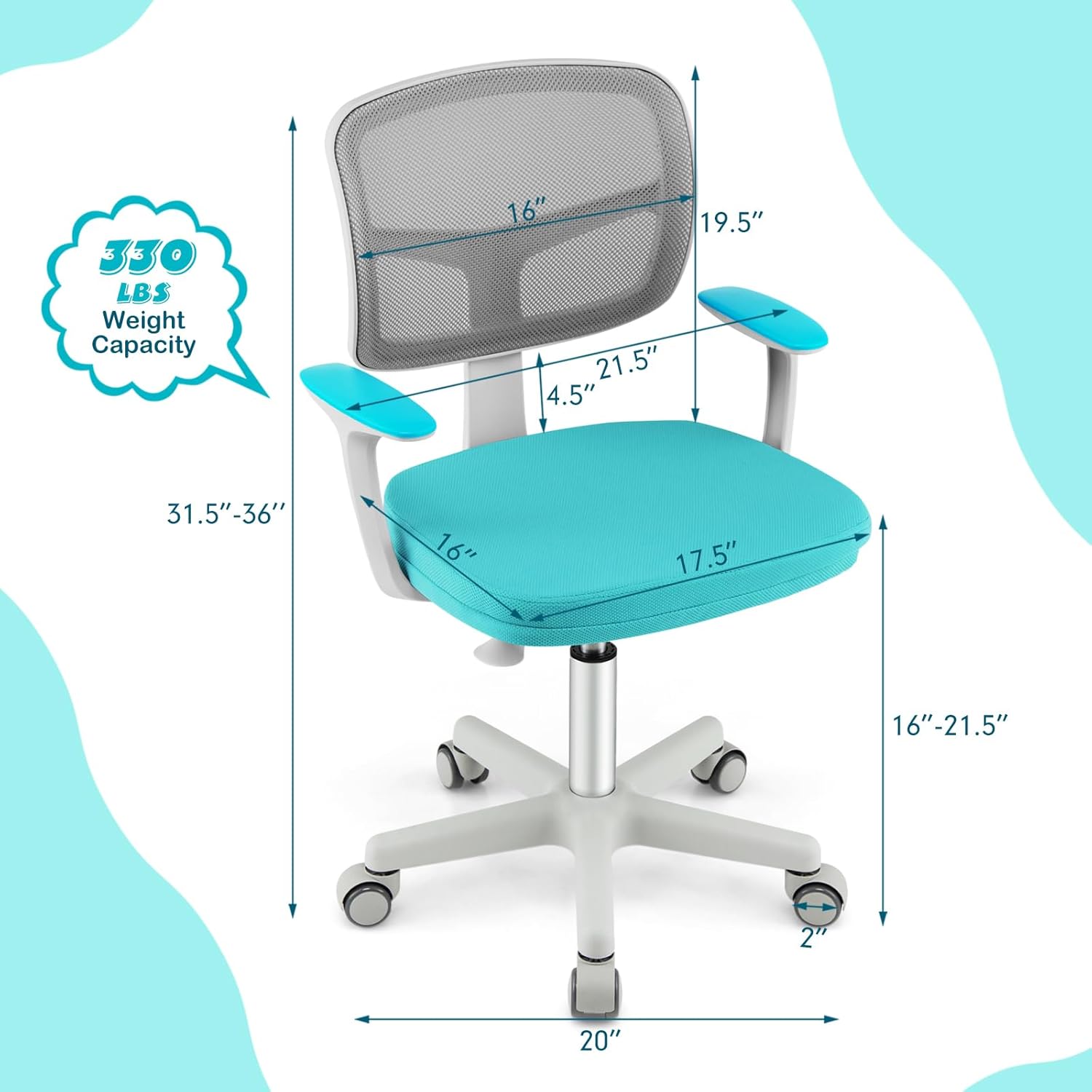Height Adjustable Function: Featuring a premium gas rod, the kids computer chair lifts up and down from 31.5” to 36” with just a press on the adjusting lever. It keeps up with the growing kids at different heights and allows your child to set the task chair in the most comfortable form, suitable for kids and teenagers.