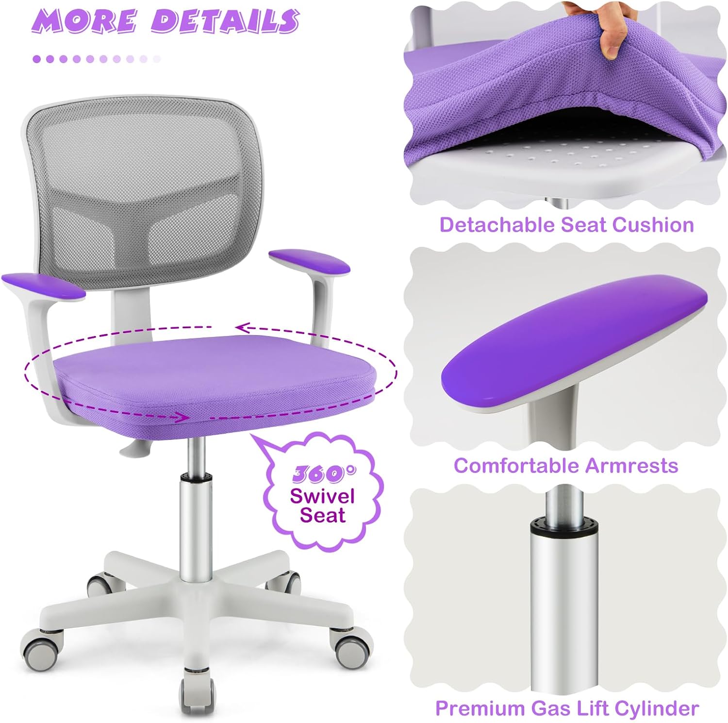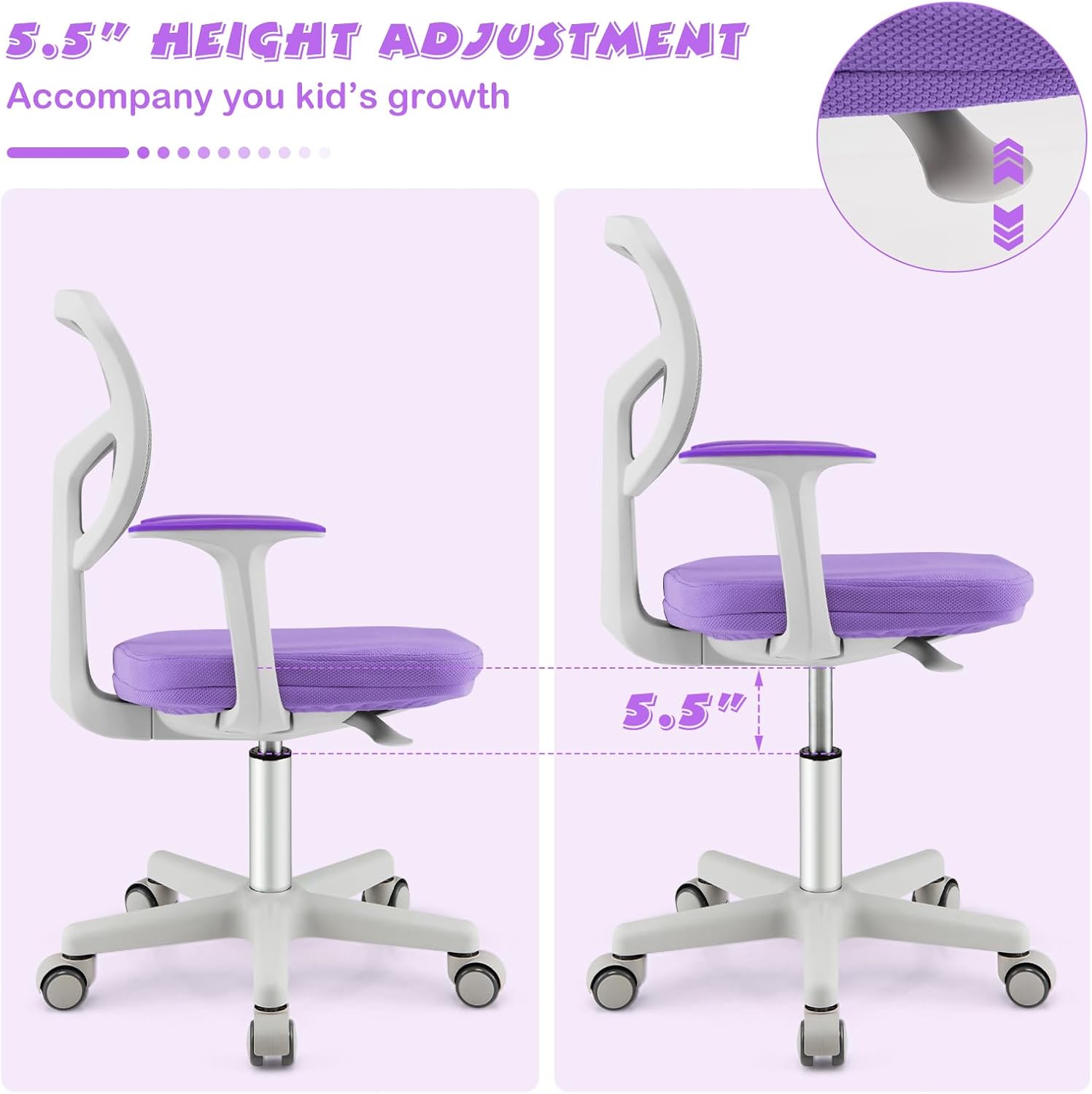Generously Upholstered Mesh Chair: Thanks to a thick-padded seat with a high-density sponge, this child desk chair creates a comfortable and concentrating studying environment for your kids. The mesh back keeps air ventilated to prevent heat from going up while sitting for a long time. In addition, the seat cushion can be removed for cleaning.