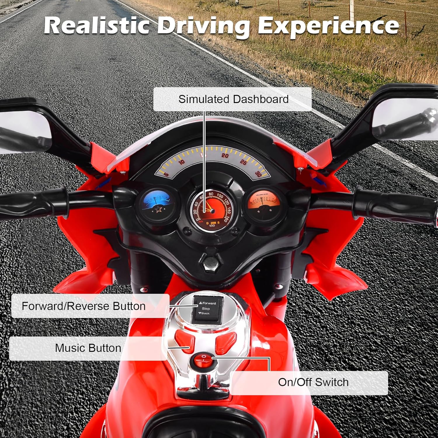 【Easy to Ride for Kids】Equipped with ON/OFF & Forward/Backward/Stop switches for easy ride while being secured with a limited maximum speed of 1.86mph. Your baby can operate this 6V battery powered motorcycle for kids easily by himself/herself by foot pedal for acceleration.