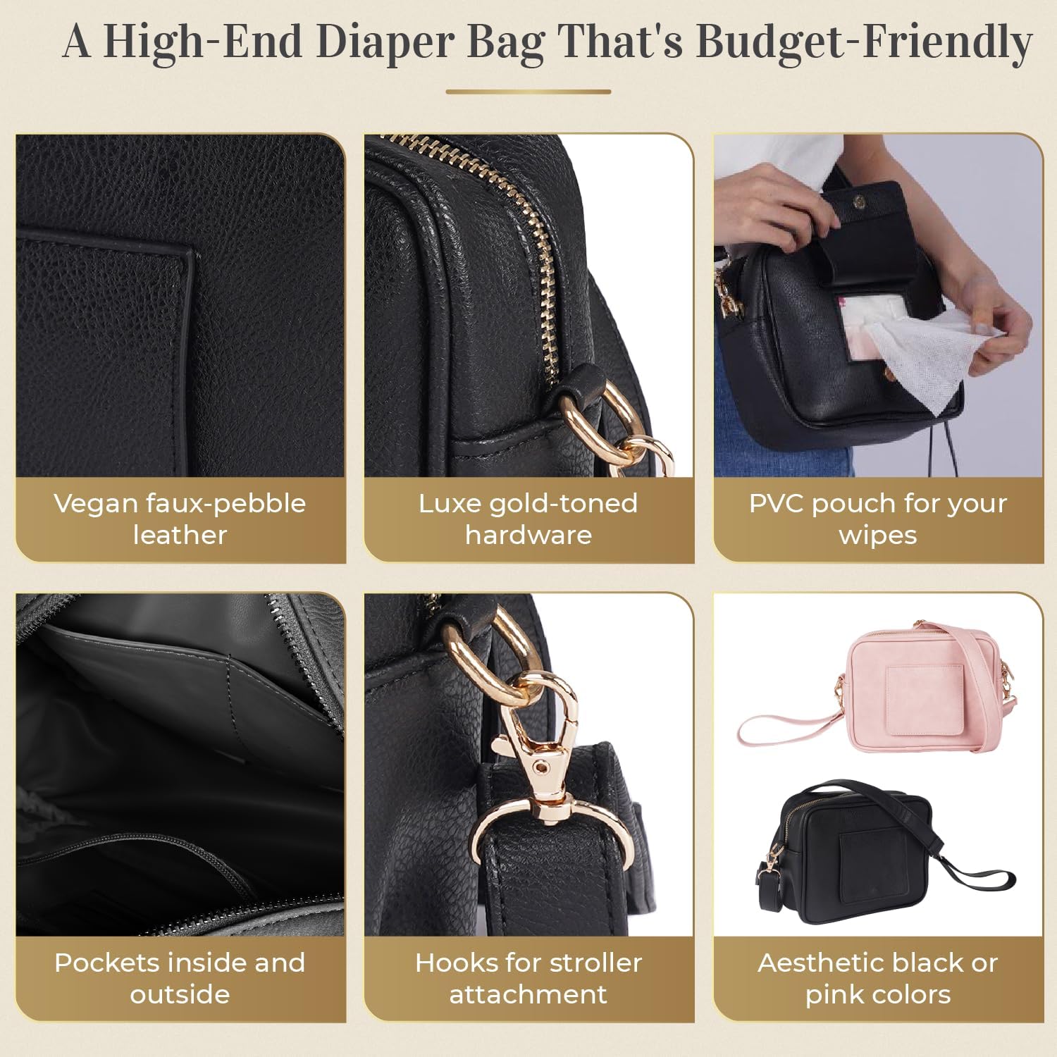 Faux-Pebble Leather & Stylish Gold Accents: Our multipurpose purse diaper bag for women is made from textured vegan leather with gold-toned hardware and a PVC wipe dispenser with a discreet flap; And it’s available in two trendy colors: black or pink