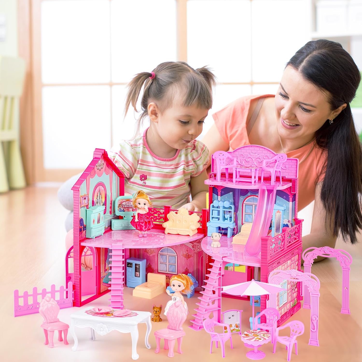 Doll House with Furniture — This cute doll house comes with a 3-story doll house with open space to decorate,including 2 figure dolls,2 dogs,1 slide,sofas, chairs,wardrobes,TV,beds,tables,stairs and other accessories.Girls can decorate their own dollhouse with the included furniture and accessories.