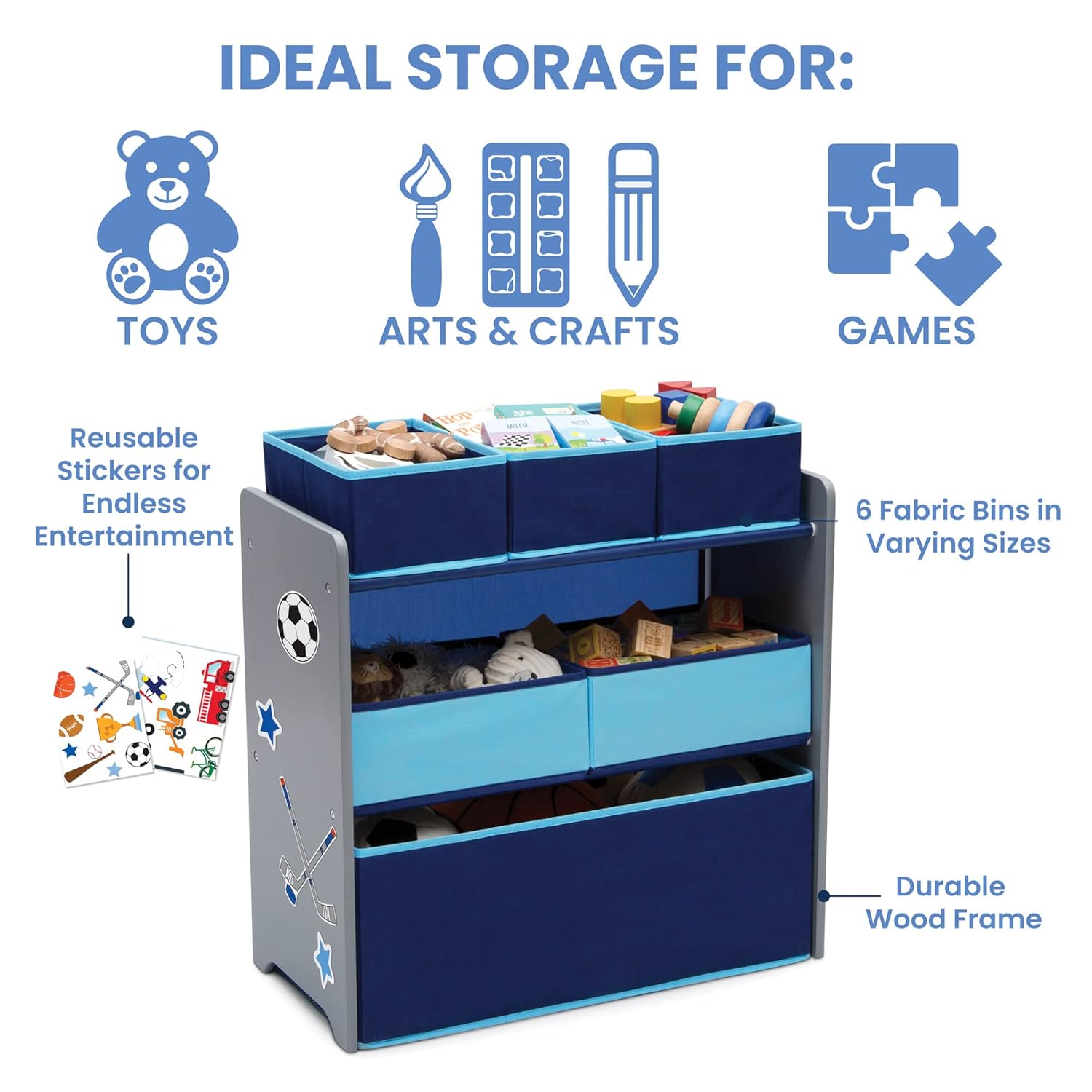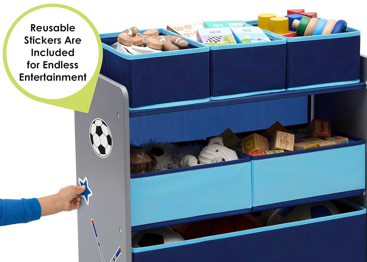 Featuring 6 bins in various sizes, this Design and Store 6-Bin Toy Organizer by Delta Children makes it convenient for kids to sort and store their belongings—giving them easy access to their favorite playthings. With 3 rows of bins, it can be used for storing toys, books, accessories and more. This toy bin also comes with reusable vinyl cling stickers that allow your child to decorate the sides themselves, the stickers feature sports equipment, automobiles and more. A great addition to your child’s bedroom, the living room or playroom, or wherever you need extra storage, the Design and Store 6-Bin Toy Organizer by Delta Children pairs perfectly with other items from Delta Children in coordinating colors.