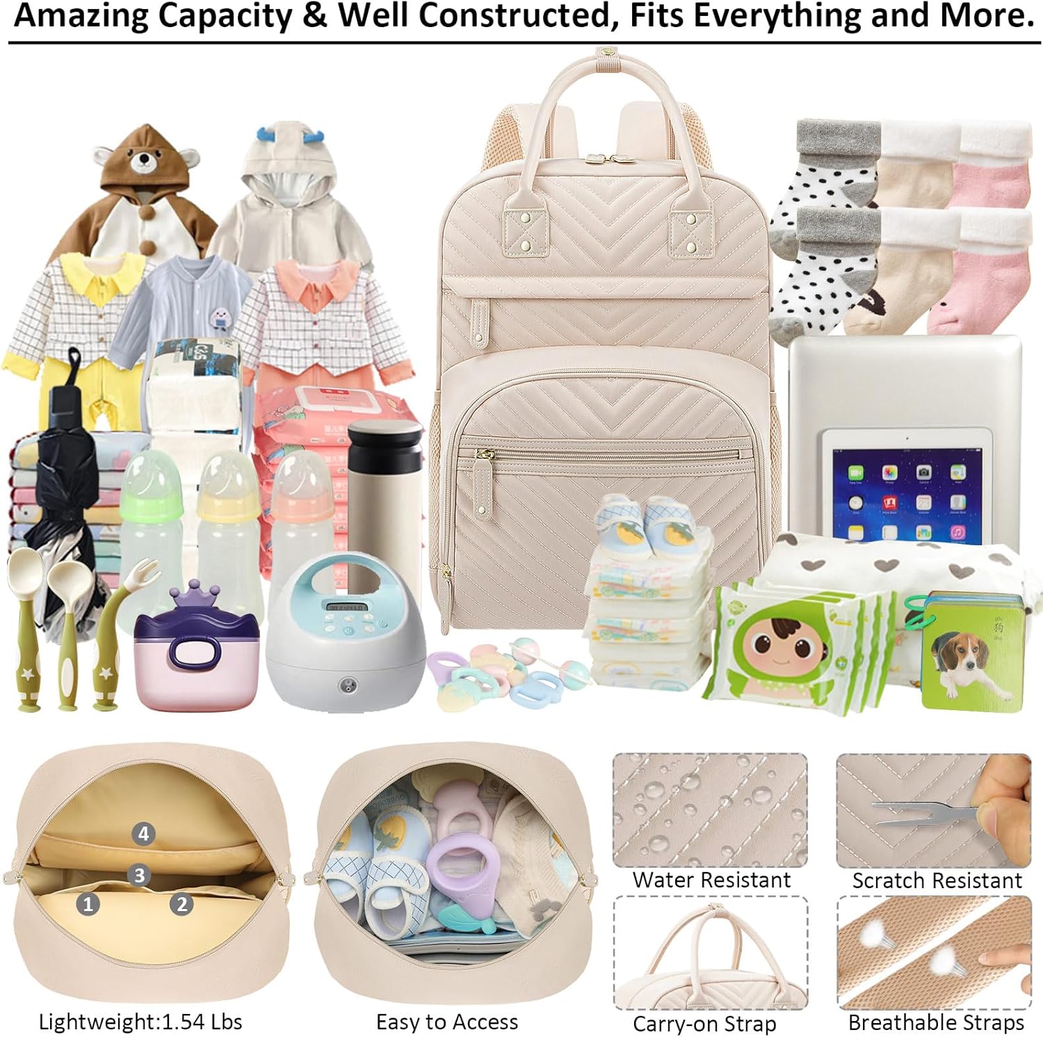 Impressed With Overall: Tenot baby backpack diaper bag only 1.54 lbs, but comes with 10 pockets and spacious to keep diapers, breast pump, wipes, formula, toys, cell phones, baby bottles, books, laptop, clothes well organized; The quality is top-notch, strong zipper, sturdy stitching, detachable stroller straps; Especially has 3 insulated bottle pockets to keep warm/cold 2-4 H; This makes diaper bag purse very durable and will not easily fall apart; A good bet baby boy baby girl diaper bag