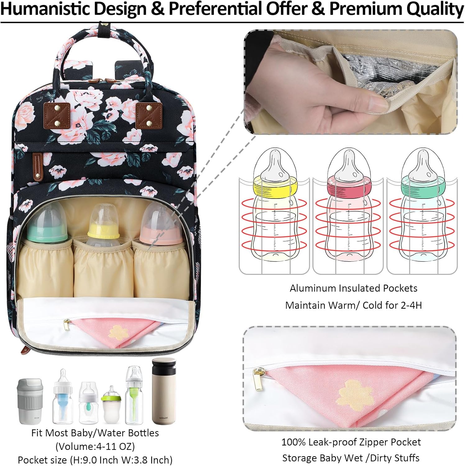 Impressed With Overall: Tenot baby backpack diaper bag only 1.54 lbs, but comes with 10 pockets and spacious to keep diapers, breast pump, wipes, formula, toys, cell phones, baby bottles, books, laptop, clothes well organized; The quality is top-notch, strong zipper, sturdy stitching, detachable stroller straps; Especially has 3 insulated bottle pockets to keep warm/cold 2-4 H; This makes diaper bag purse very durable and will not easily fall apart; A good bet baby boy baby girl diaper bag
