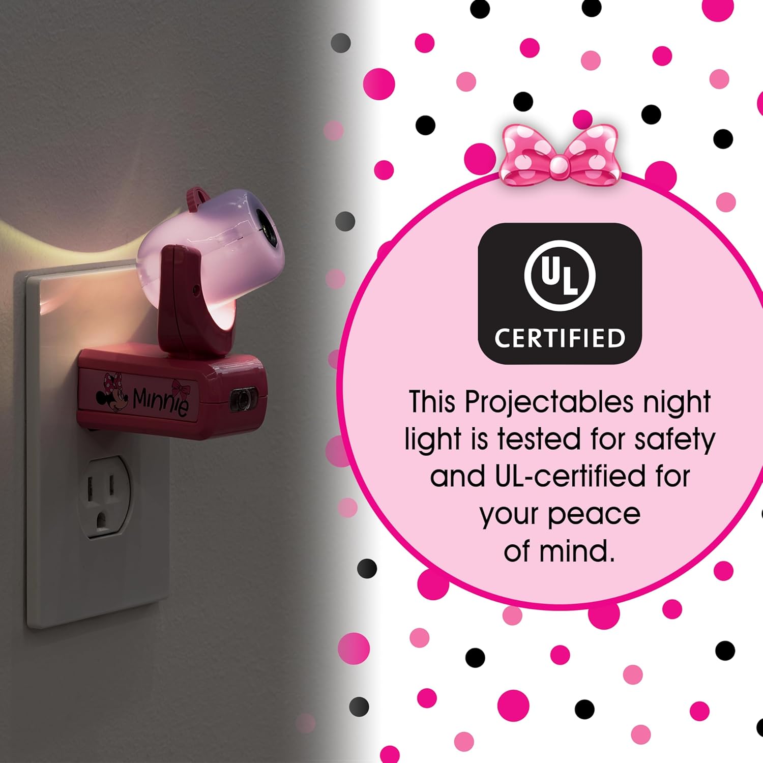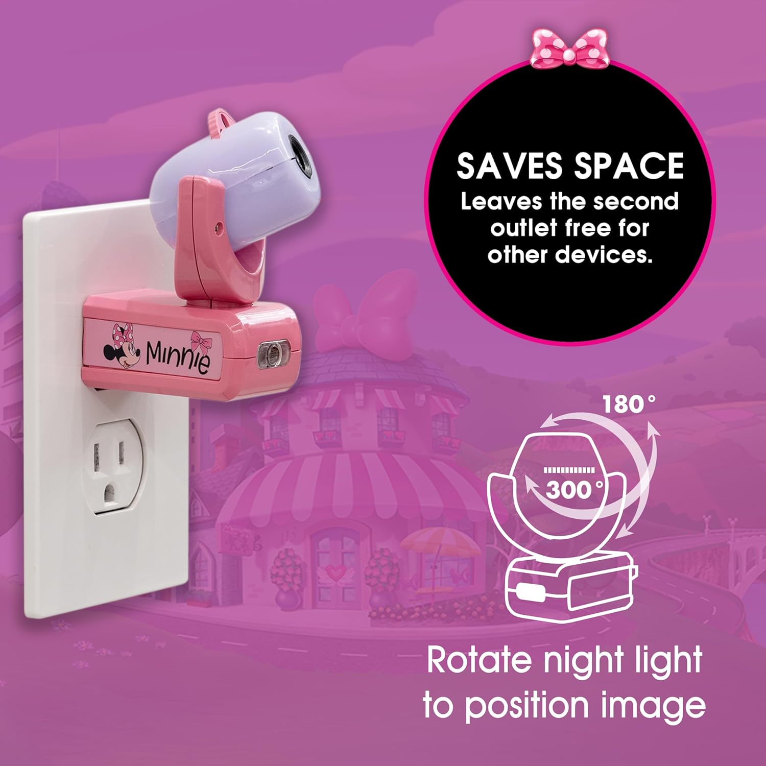 MINNIE MOUSE CHARM – Let your favorite projected image of the loveably iconic Minnie Mouse guide your way at night and lull you to sleep when you climb into bed—perfect for bedrooms, playrooms, nurseries and more