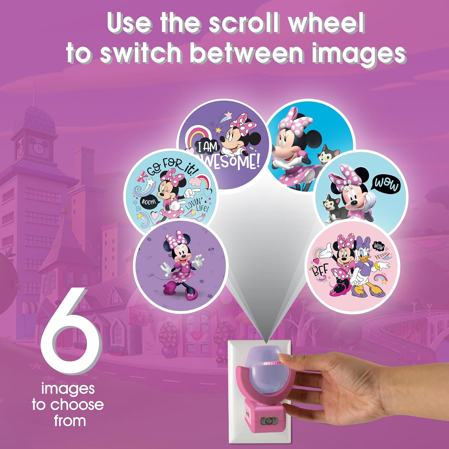 PROJECTABLES MAGIC – Easily use the built-in scroll wheel to choose from six colorful 3-foot images that showcase the lady mouse herself projected onto your wall, ceiling or floor