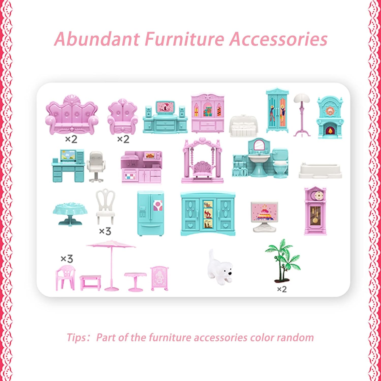 【Safe & Premium Material】: Our fancy doll house is made of BPA-free and non-toxic ABS plastic and child-friendly material, each part of this princess house is made to be smooth, round and burr-free for our little kids and easy to assemble.