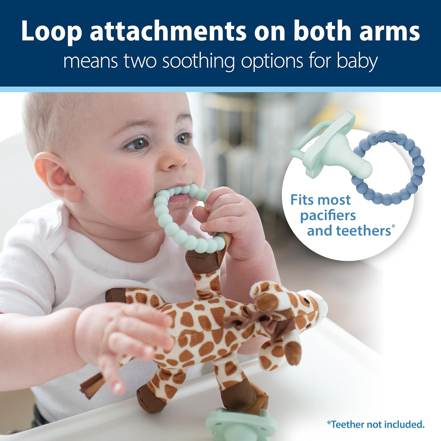 BABY PACIFIER & TEETHER HOLDER. Designed to keep baby’s pacis and teethers close by, the Lovey securely holds most pacifiers and teethers and includes a 100% silicone Dr. Brown’s HappyPaci pacifier.