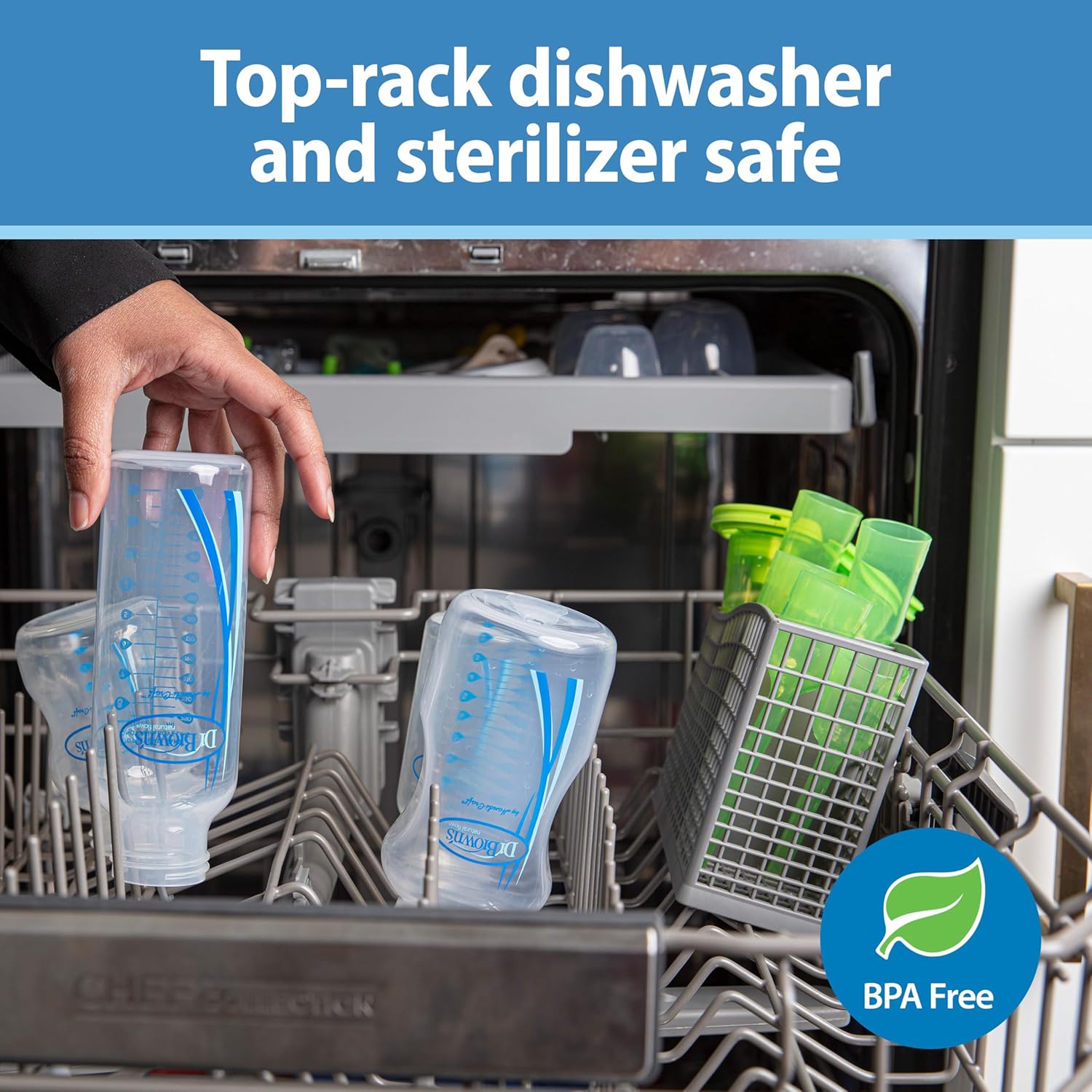 DISHWASHER SAFE. Safe for use in dishwasher (top rack only), electric and microwave sterilizers or boiling water. BPA Free.