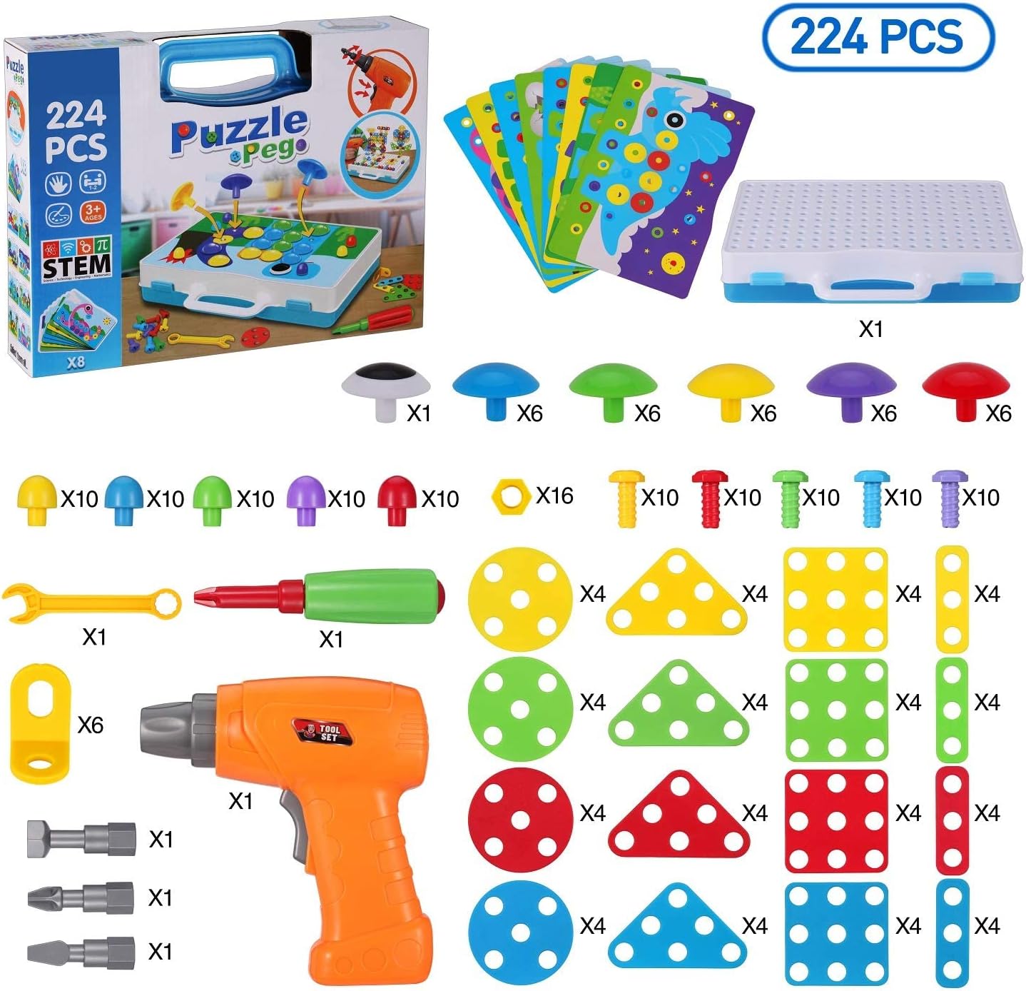 【Complete Engineering Kit】This creative mosaic drill set with 224 pieces. With the real electric drill toys, kids can screw and unscrew the nut/bolts in the set. To achieve STEM development with Basic engineering, construction play, and early math instruction.