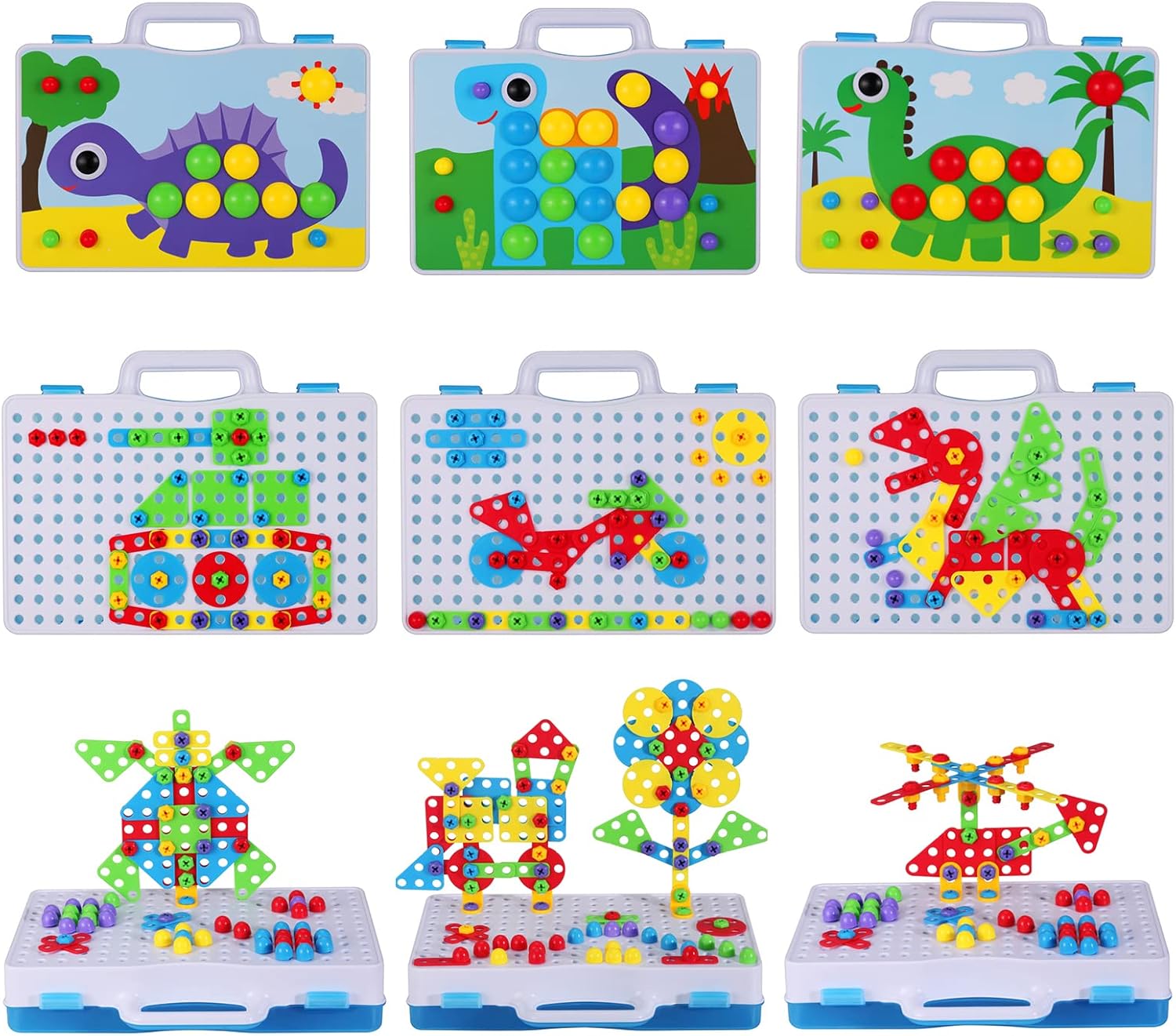 Kids can design and create 3D buildings, animals, etc. Perfect for your little designer and architect of the future; Button art game is designed for little hands improving hand-eye coordination, fine motor skills and creative thinking by snapping small mushroom nails into various pattern cards. Once they get the hang of it, they can go freestyle and create anything they can imagine.