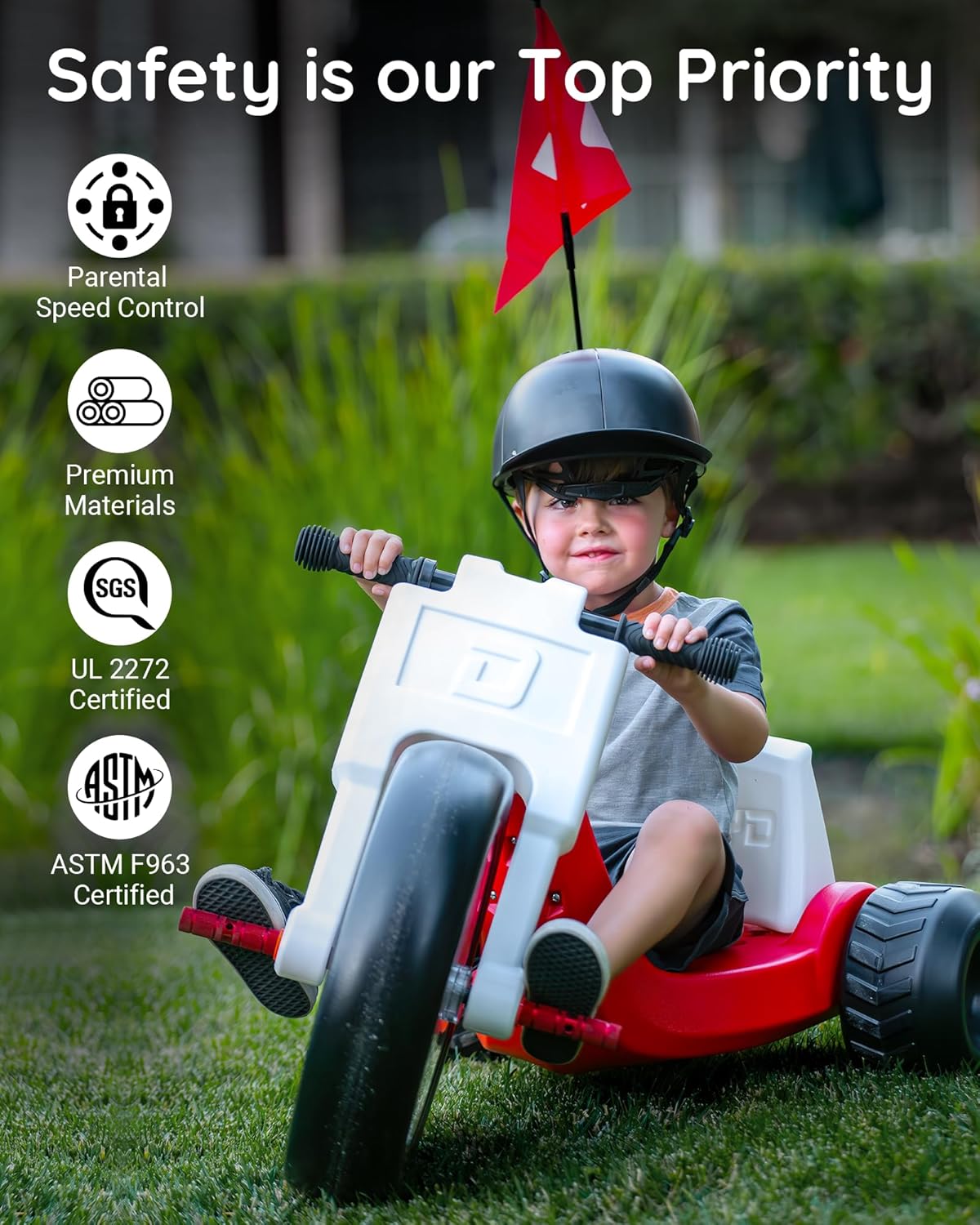 Yes to Fun, No to Pedals: Pedaling is so 2008. Droyd Romper with big wheel nostalgia meets modern tech with a classic tricycle design powered by a 24V motor instead of pedals. The Romper toddler tricycle is way cooler than ordinary tricycles