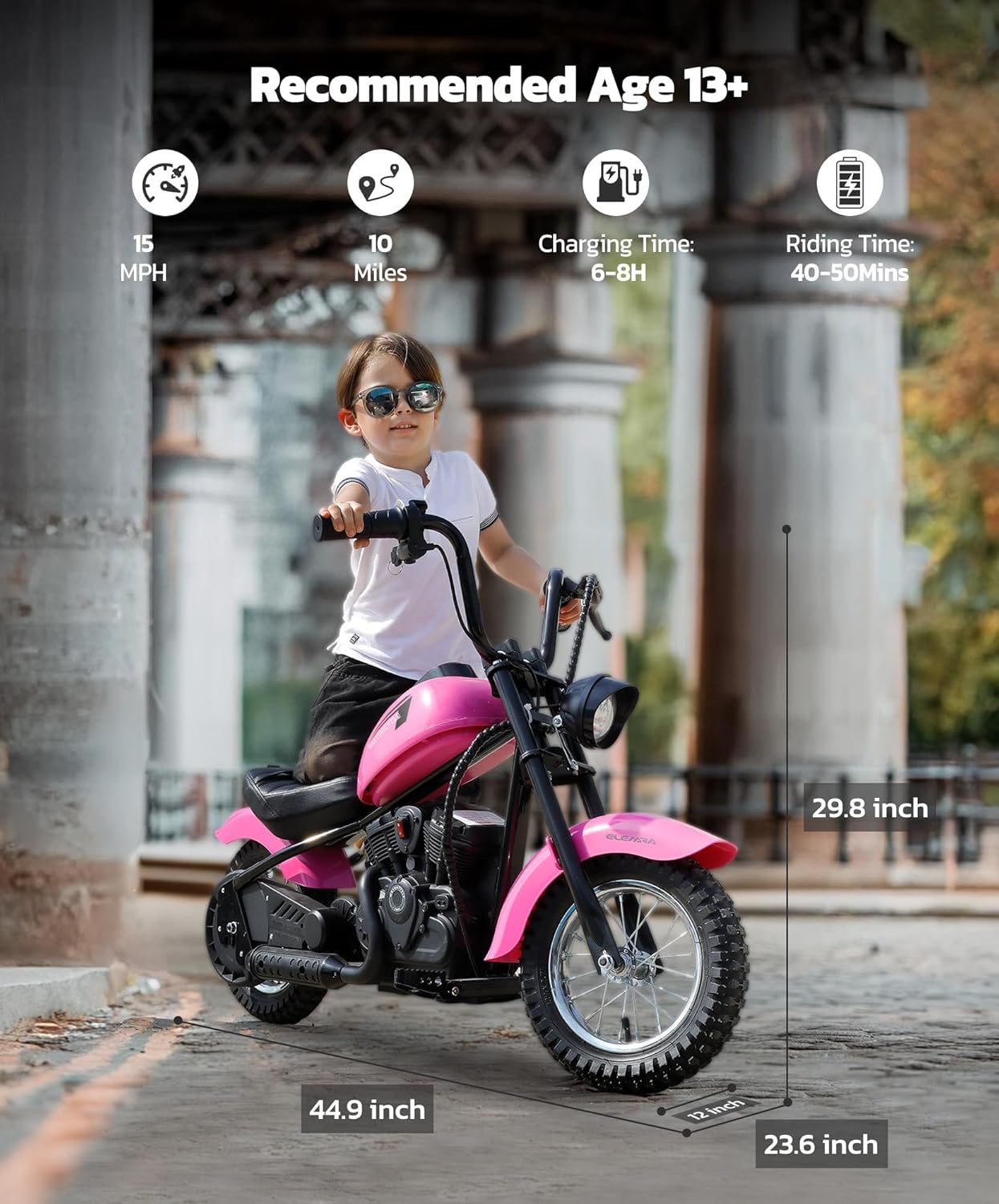 【High-Performance Electric Motorcycle】ELEMARA electric motorcycle for kids equipped with a 24V 250W powerful chain-driven motor, reaching speeds of up to 15mph and 10 Miles max range while its 150lb max weight capacity ensures fun for kids of various sizes.