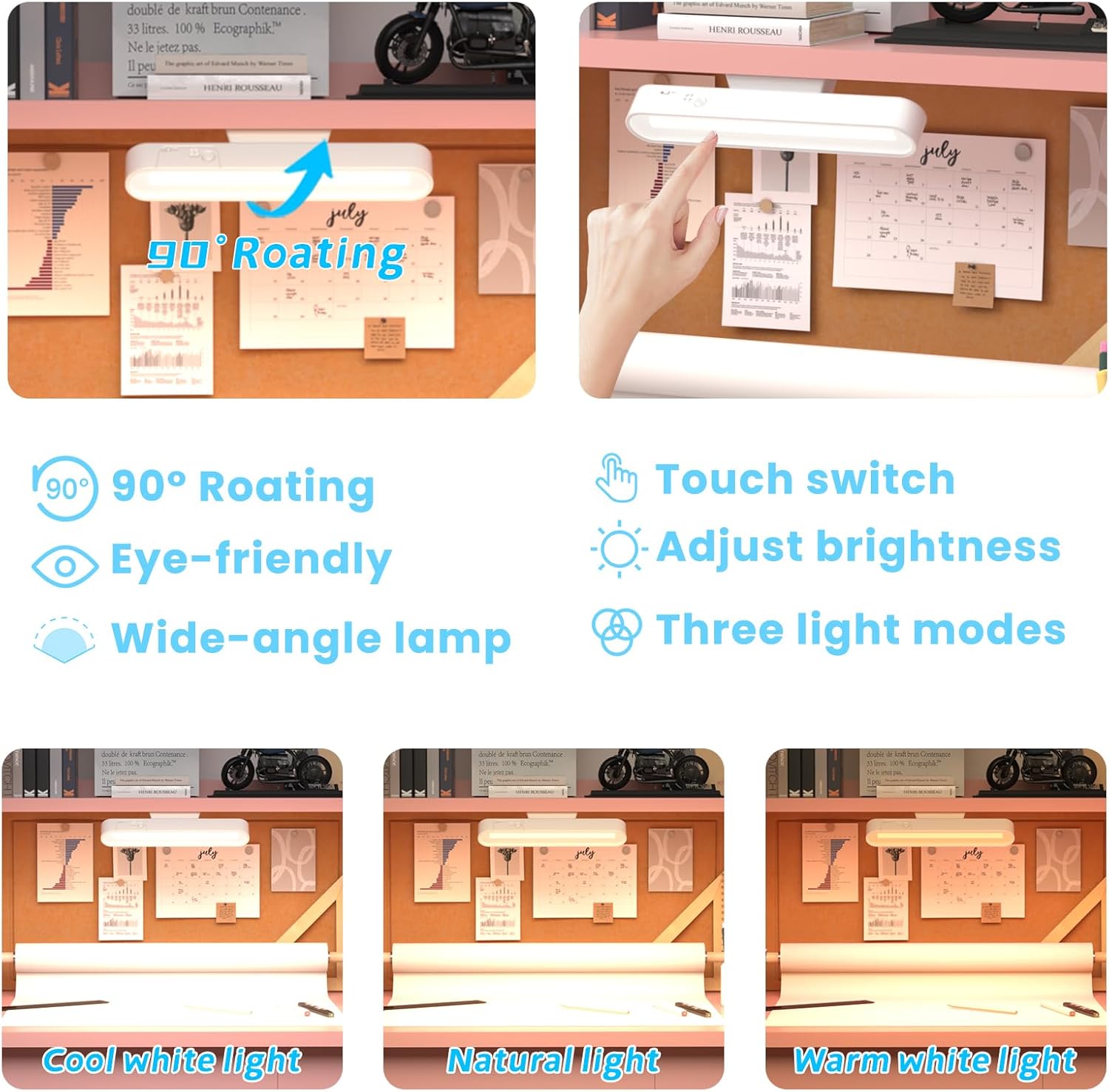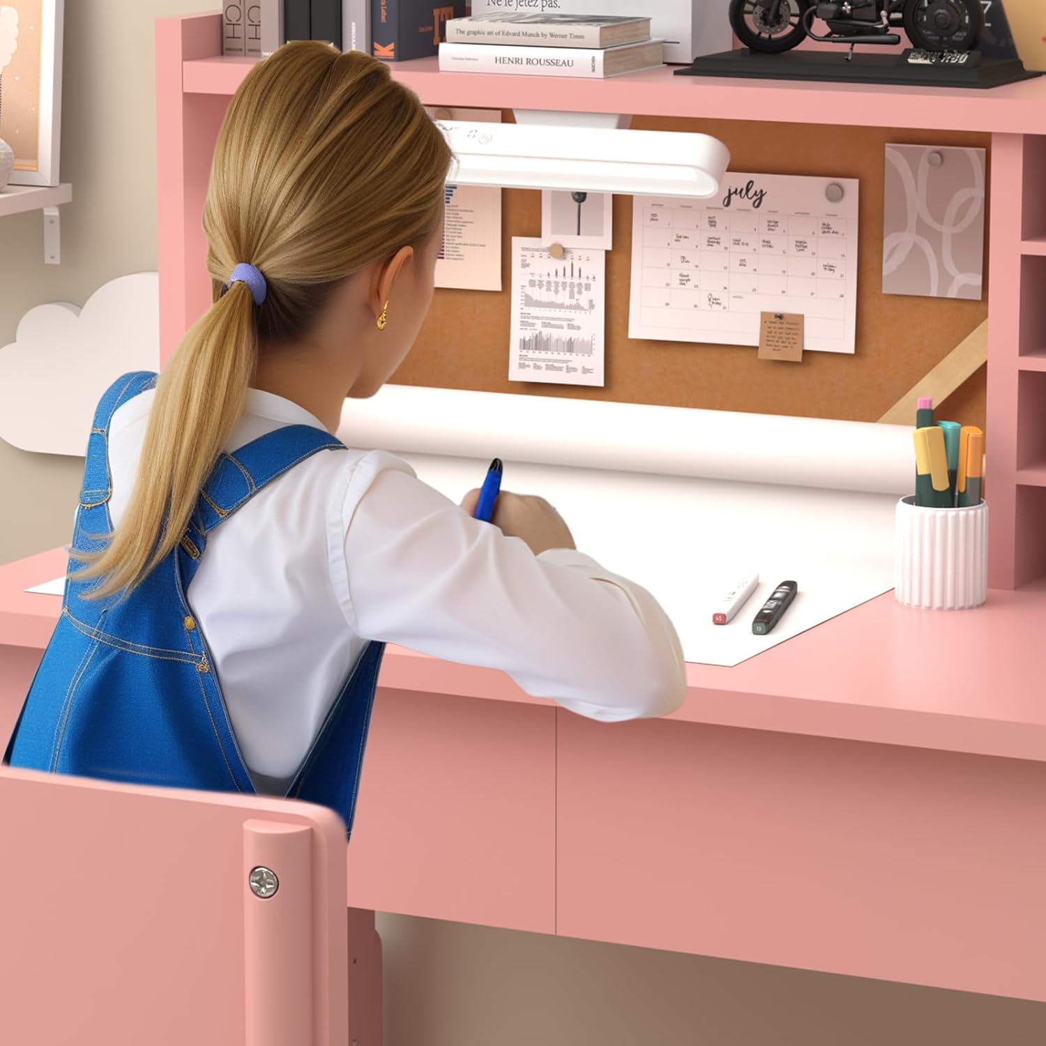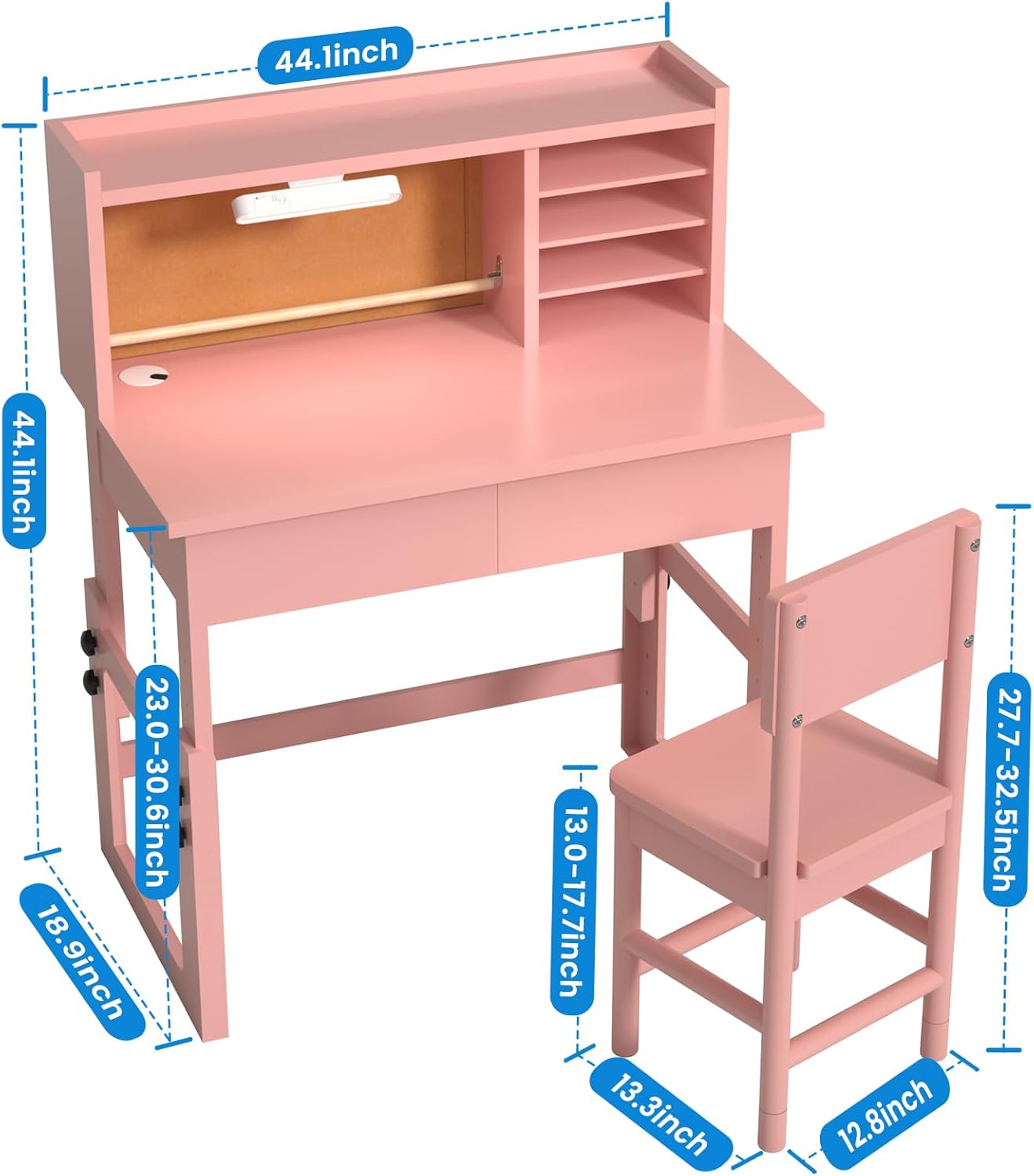 【Kids Study Table with 3-Color Lights】- kid desk equipped with detachable LED lamp,Easily paste the base of the lamp onto the computer desk for an immersive ambiance. 80° rotating multifunctional desk lamp with strong magnetic adsorption.Short press the switch to switch the light color: warm yellow, warm white, and cool white. adjust the brightness according to different scenes and needs by long pressing the switch. add a sense of glamor and style.This children’s study desk is perfect for writing, drawing, reading, and more. By adjusting the brightness, children can be more focused on learning.-rGS5GT