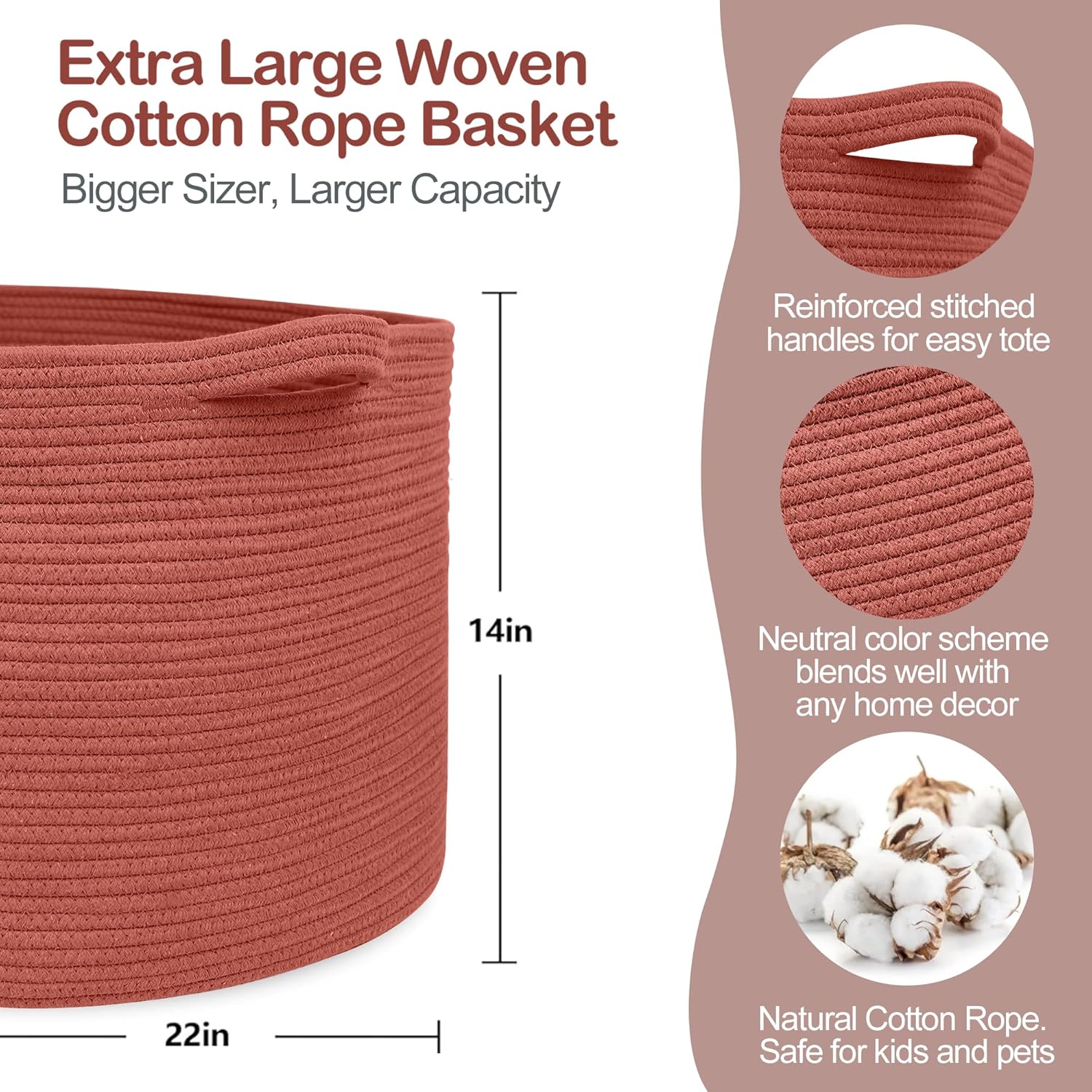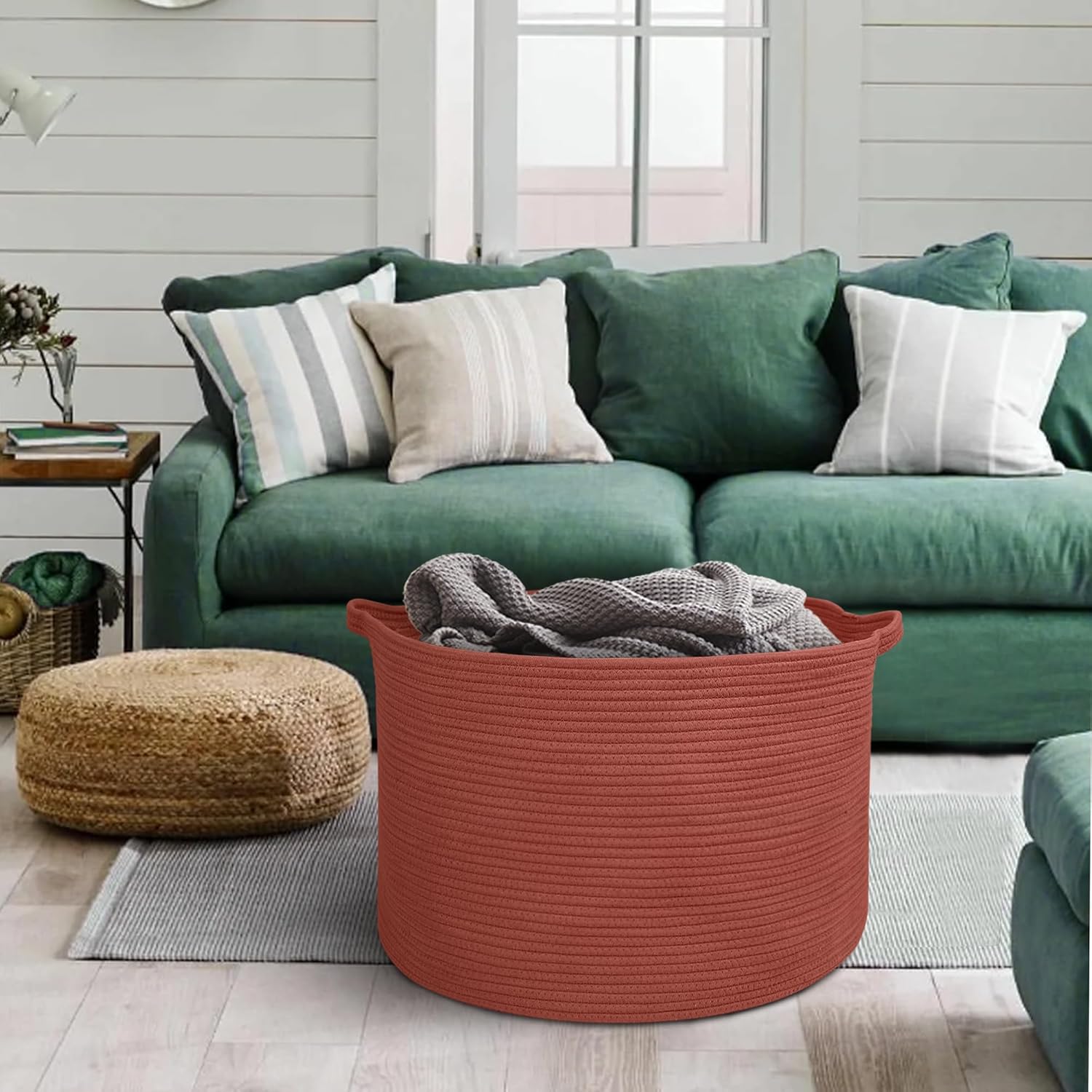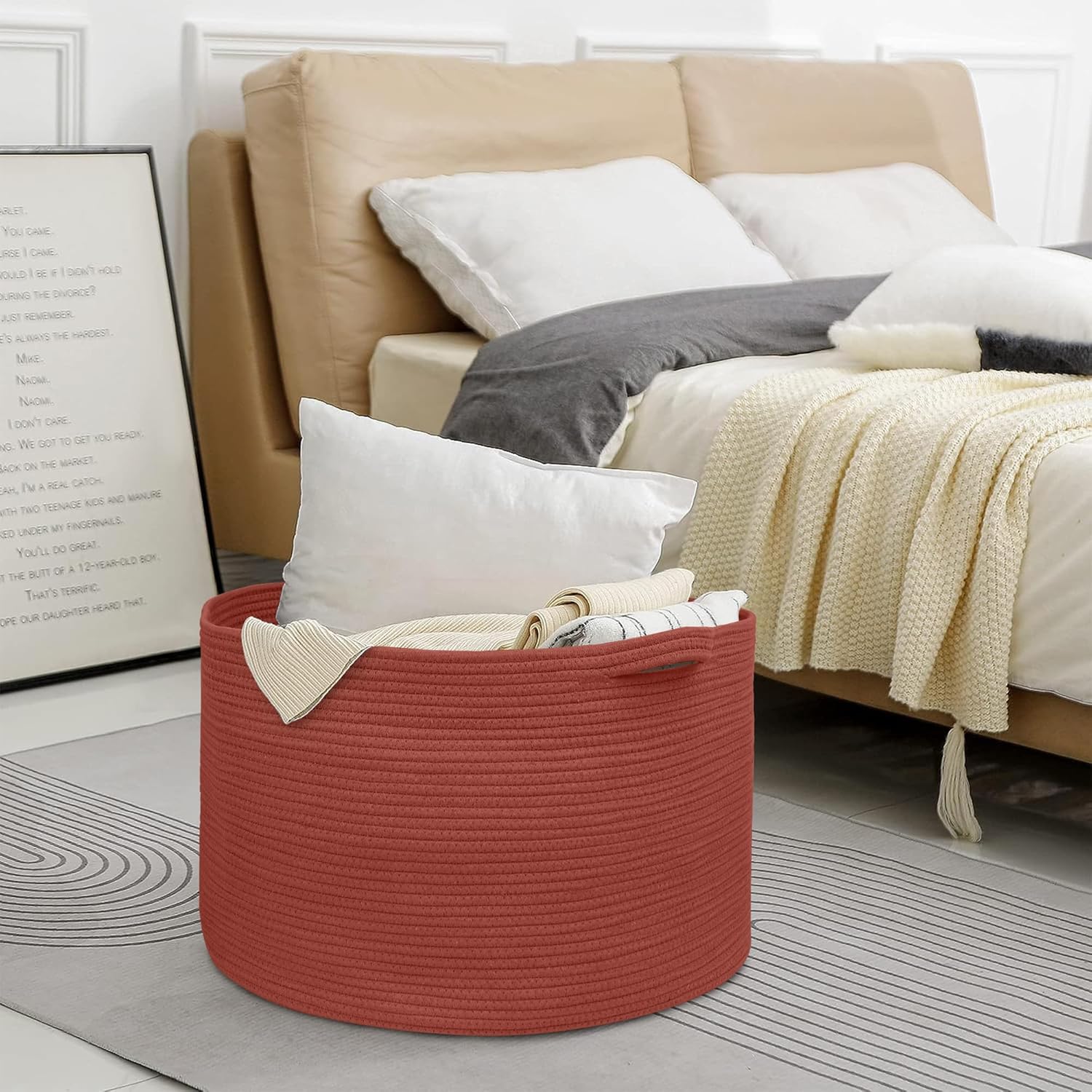 SOFT COTTON ROPE BASKET: The brick red basket is braided from natural cotton rope, making it a super soft but sturdy, textured bin. The rope basket for storage is huge and doesn’t have a smell at all. Woven rope baskets with no hard edges are safe for your kids allowing them to climb into these wick basket and won’t scratches or damage the floors.