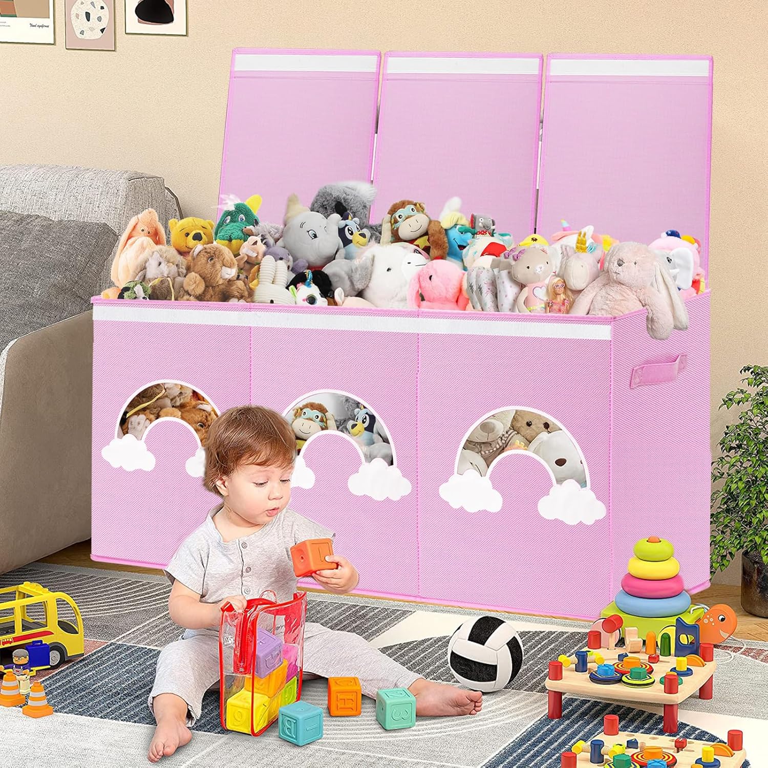 【 Extra Large Size】- Upgrade the enlarged size toy box: 35.8″x12.6″x16″, can hold more than 118 liter items. Three compartments are designed to effectively store different types of toys or household items.