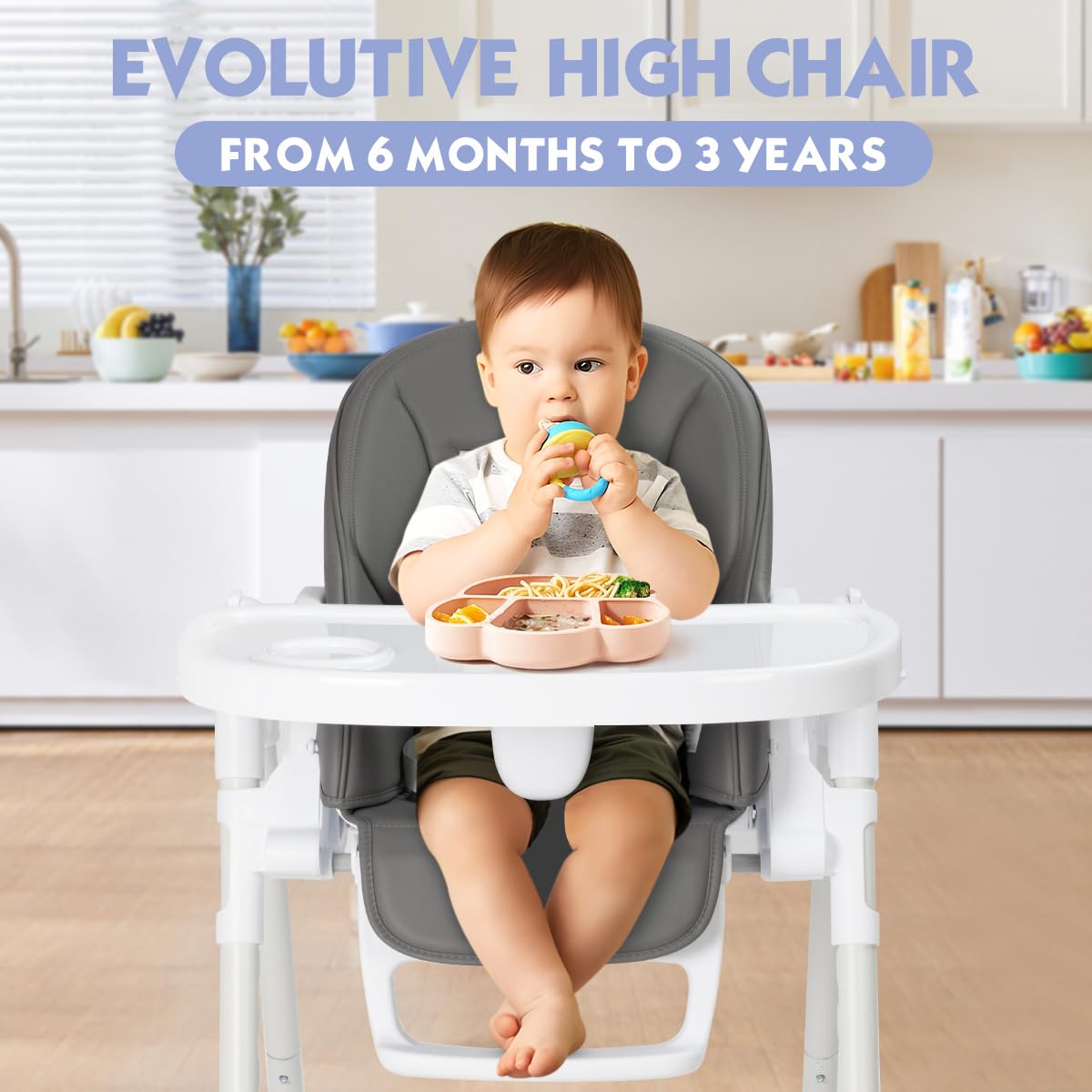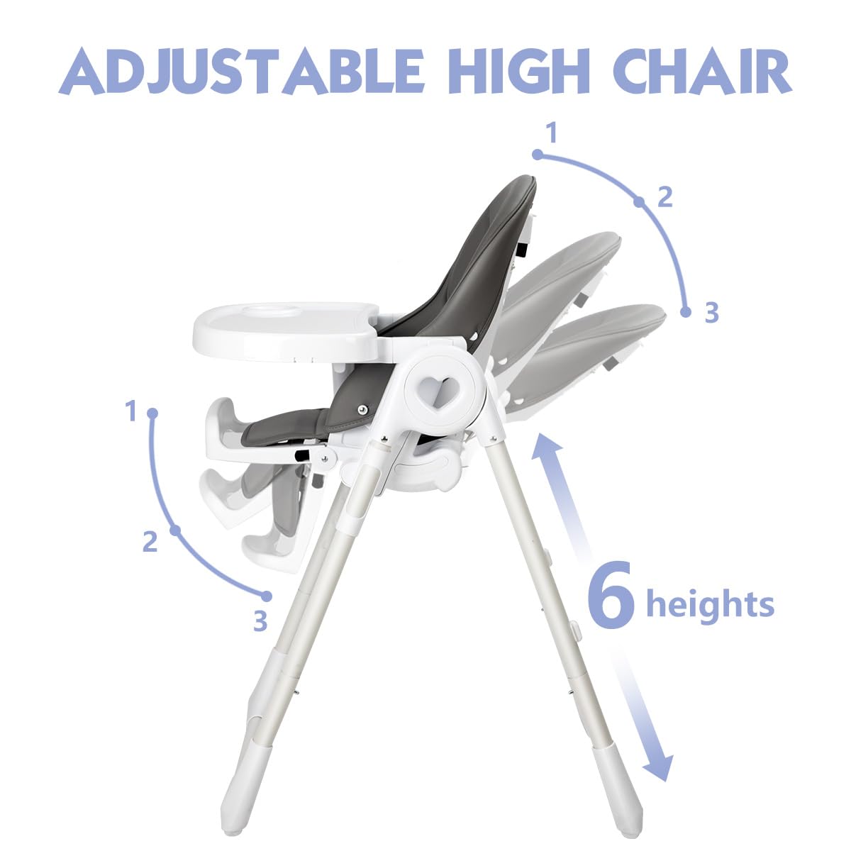 6-position height adjustment—High chair for eating, playing and relaxing in maximum comfort with a 5-Point safety harness and a removable leg divider. Solid and Sturdy with strong materials ensure that they are safe. Max child weight 50 pounds for children from 6 to 36 months old.