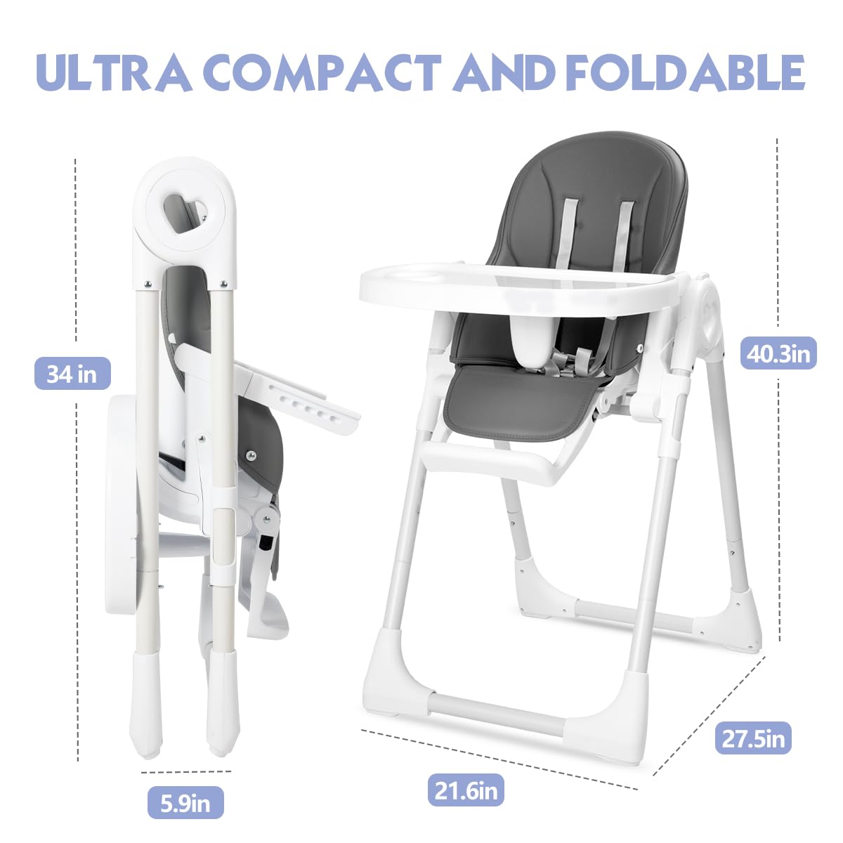 Adjustable 5-point safety harness, Compact fold for storage—-The whole chair packs up neatly and rolls on built-in rear wheels to save space between meals, fitting easily into corners, closets, and even cars when it’s time for a trip or playdate
