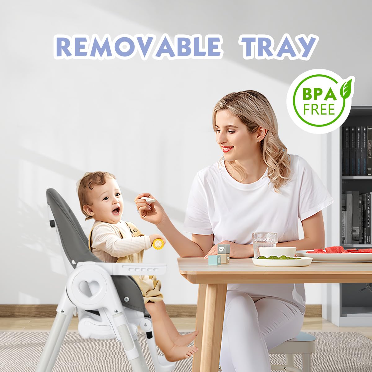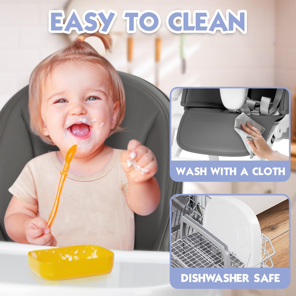 Dishwasher-safe removable tray insert—The high chair’s tray features a removable top layer for easy cleaning and access to stored toys. It locks into 3 positions to grow with your child and can be fully removed for toddlers or thorough cleanups.