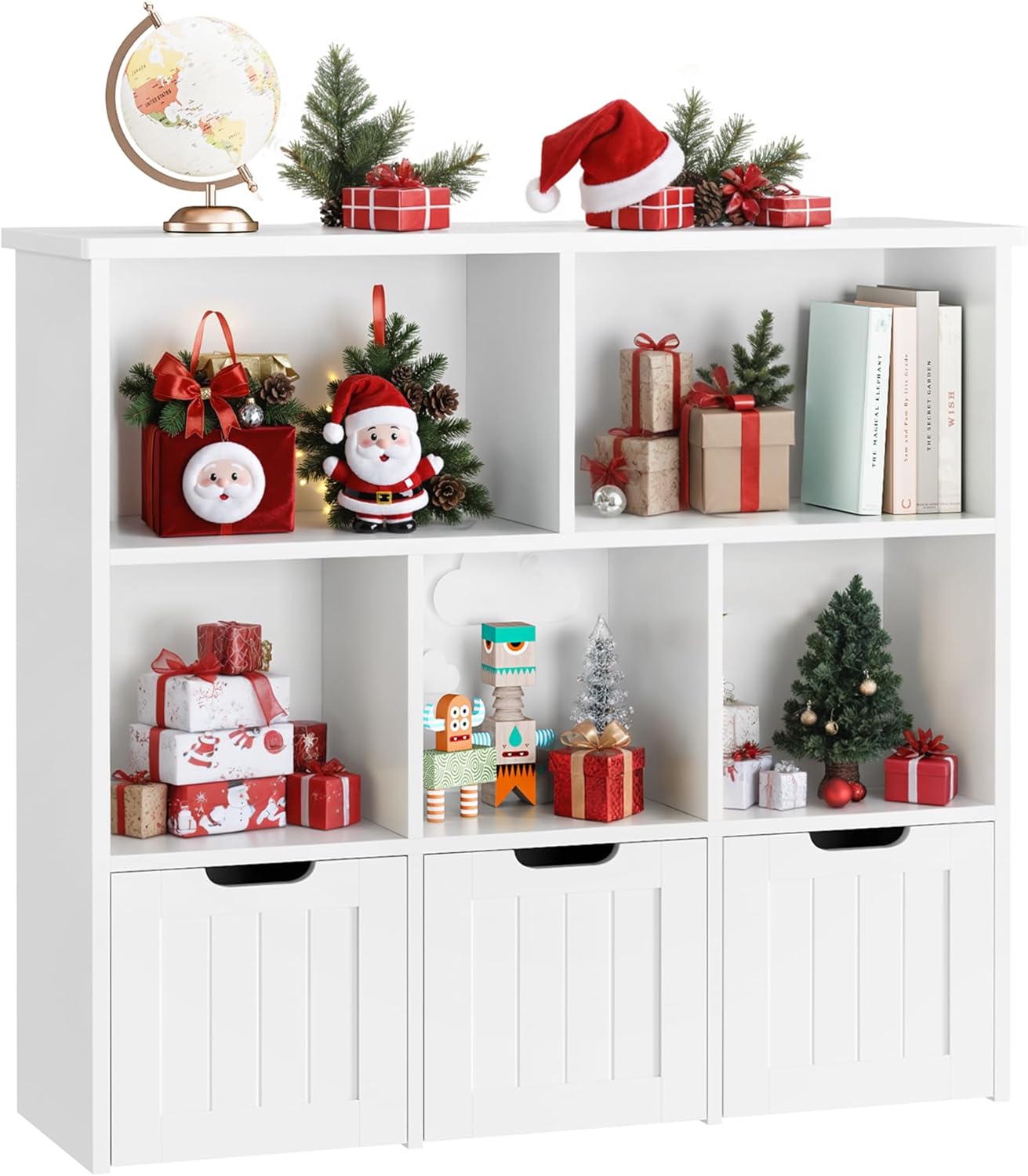 FOTOSOK Toy Storage Organizer with 3 Movable Drawers, Floor Storage Cabinet Toy Chest with Hidden Wheels and 5 Storage Cubbies, Multifunctional Storage Chest for Playroom, White