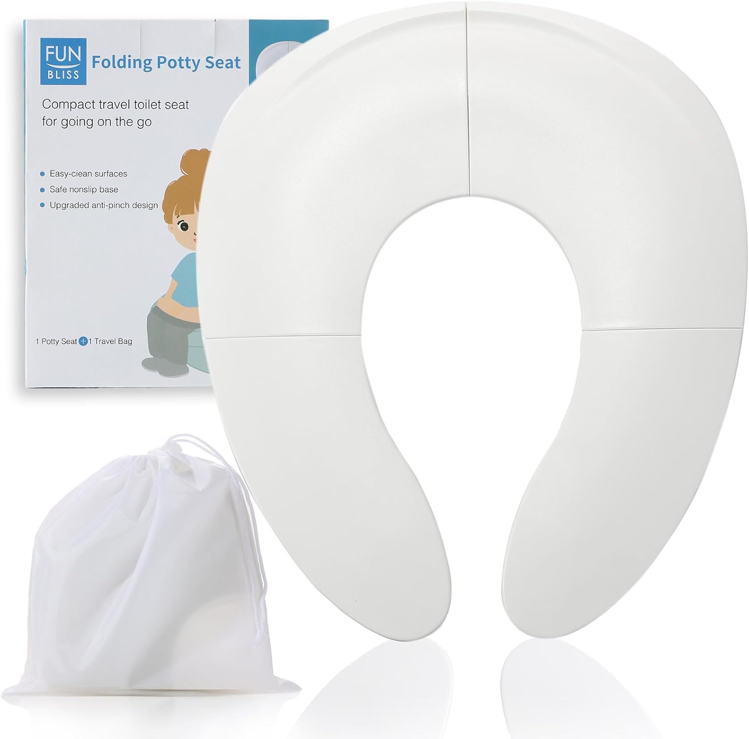 Funbliss Foldable Travel Potty Seat for Toddlers,Potty Training Toilet for Toddlers with Safety Suction Cups, Includes Storage Bag,Essential for On-the-Go Potty Training,White