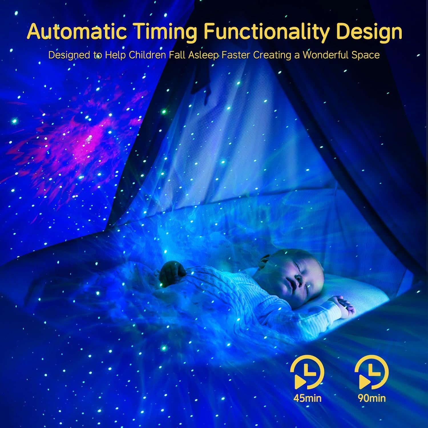 【Remote-controlled and Timer-enabled】 This Star Projector allows you to adjust brightness, speed, and breathing frequency anytime, anywhere, to achieve your desired lighting effects and ambiance. Additionally, you can set a timer for the light to turn off, with options for 45 minutes and 90 minutes. The starry sky light will automatically turn off at your set time, saving your electricity.