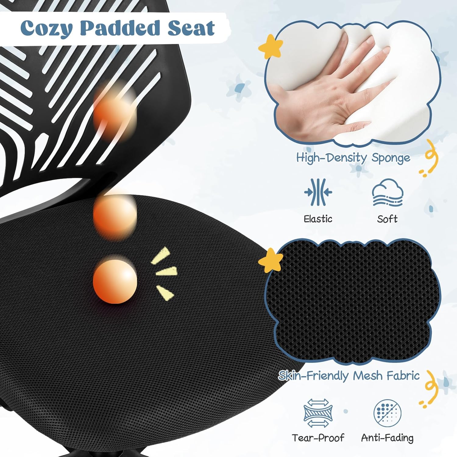 [Optimal Comfort]:Elevate your kid’s study experience with this chair’s generously padded seat made from high-density foam and covered with a double-layered mesh. The thick padded upholstery is soft to the touch and resilient, ensuring lasting comfort and durability. The chair’s relatively wide and deep seat, measuring 18″×18″×3.5″(L×W×Thickness).