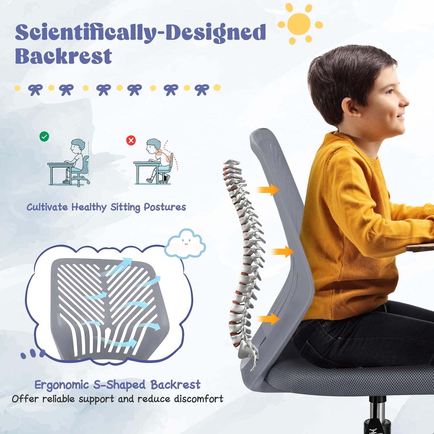 [Ergonomic Support]: This kids desk chair is designed with an S-shaped backrest that provides full support to the back and lumbar region, promoting improved sitting posture during long office hours and study sessions. Its hollowed surface increases airflow and reduces heat buildup for added comfort.