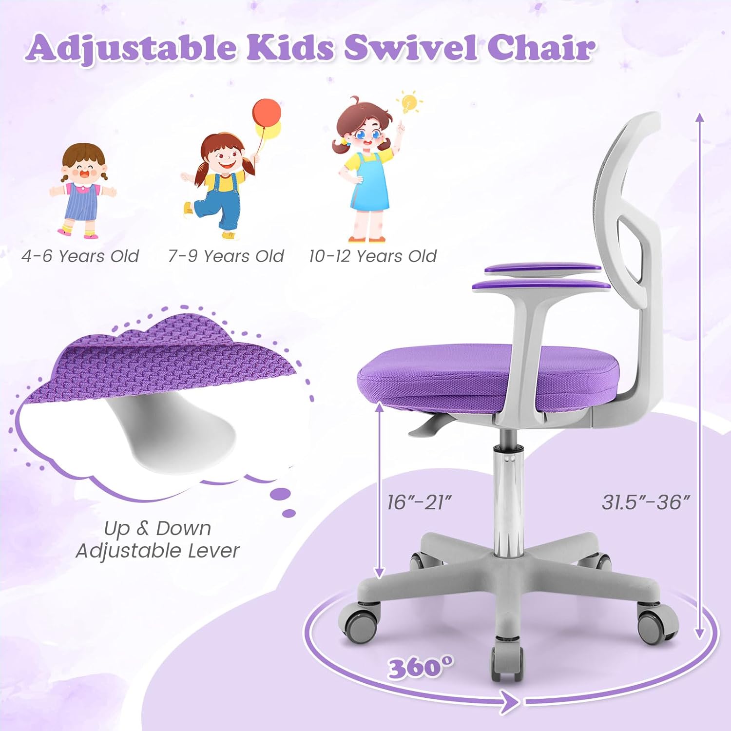 Giantex Kids Desk Chair, Children Computer Chair with Wheels and Y-Shaped Lumbar Support, Mesh Kids Office Chair, Height Adjustable Desk Chair for Girls Boys Aged 4-13, Purple