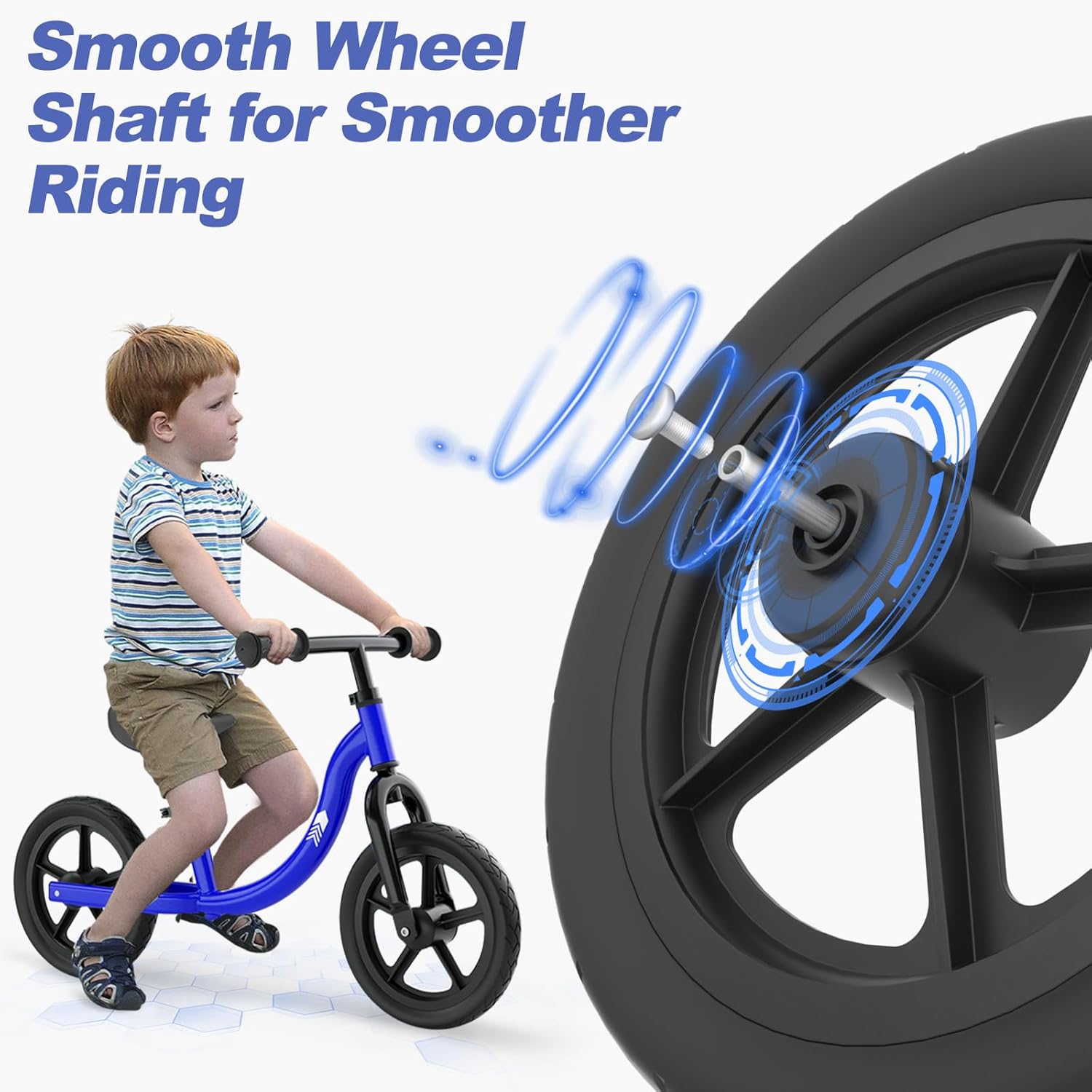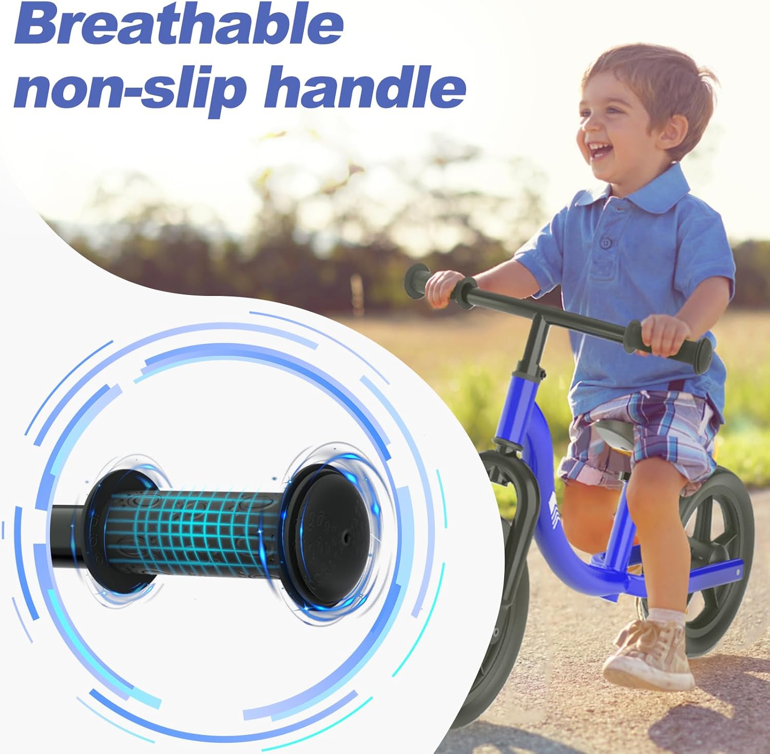 SAFE DESIGN: Made of anti-rust carbon steel, this kids balance bike is sturdy and lightweight enough for baby to use. The EVA polymer foam wheels are suitable for variety of pavement. Non-slip and breathable rubber handle can perfectly protects kids hands. With the 360 degree rotating handlebar, baby can flexibly operate the balance bike. The most important thing is all materials are eco-friendly so toddler can have fun with this bike without worry.