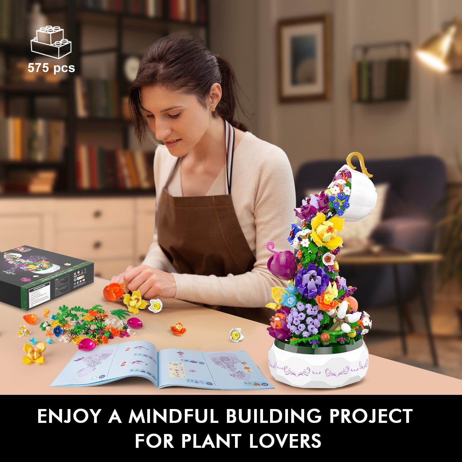 【Creative Flowers Music Box Building Set】This 571 pcs botanical collection flowers building block kit with brightly color, spring-filled flower pours out of the teacup like a waterfall of flowers into the heart. Inspired by real flowers, including rose, orchids, carnation, hydrangea, peony and more. This flower botanical collection building set with romantic and creative is the perfect gift for every mom wife girls and lover