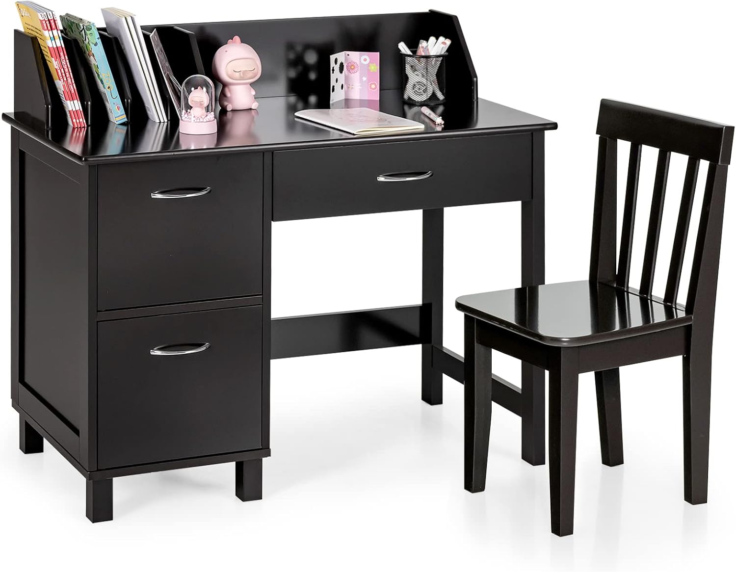 With the large tabletop, your child will have enough space to unleash his/her creativity. And the stand-up organizer, pull-out drawer and 2 storage cabinets help your kid to learn the importance of staying organized. We wanna make your little scholar feel comfortable. Therefore, this chair is ergonomically designed with curved backrest and wide seat for a comfy sitting experience. As for safety, this student study table and chair set features rounded corners for all-around protection. Don’t worry about the durability. The selected material ensures a lasting performance to your child’s developmental years.