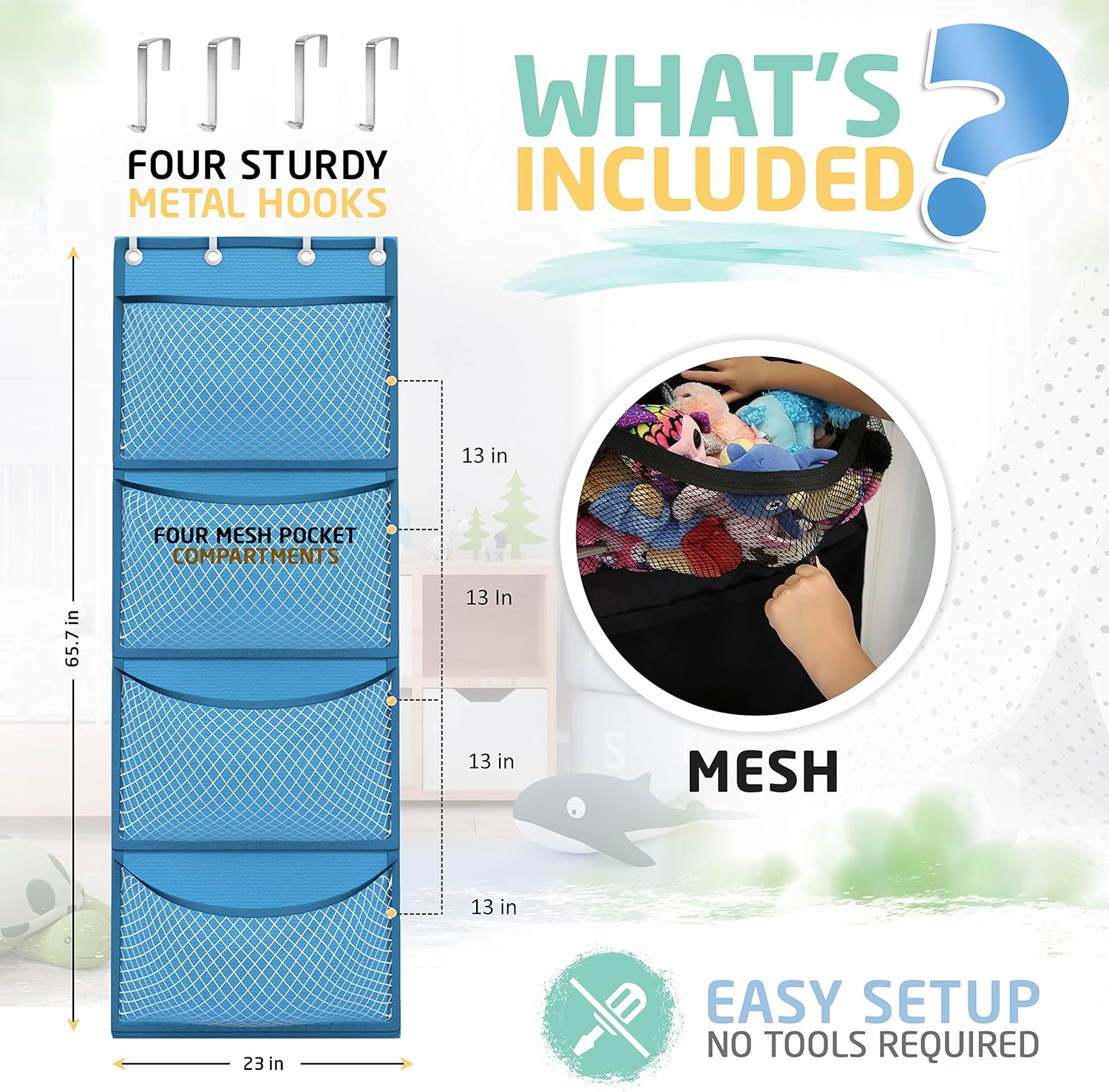 🧸 CONVENIENT STUFFED ANIMAL STORAGE – The perfect stuffed animal organizer to easily store and organize your favorite toys in our over the door storage unit. Easy to setup, durable, and allows kids convenient access to their toys. Equipped with breathable mesh pockets keeping your stuffies fresh and clean