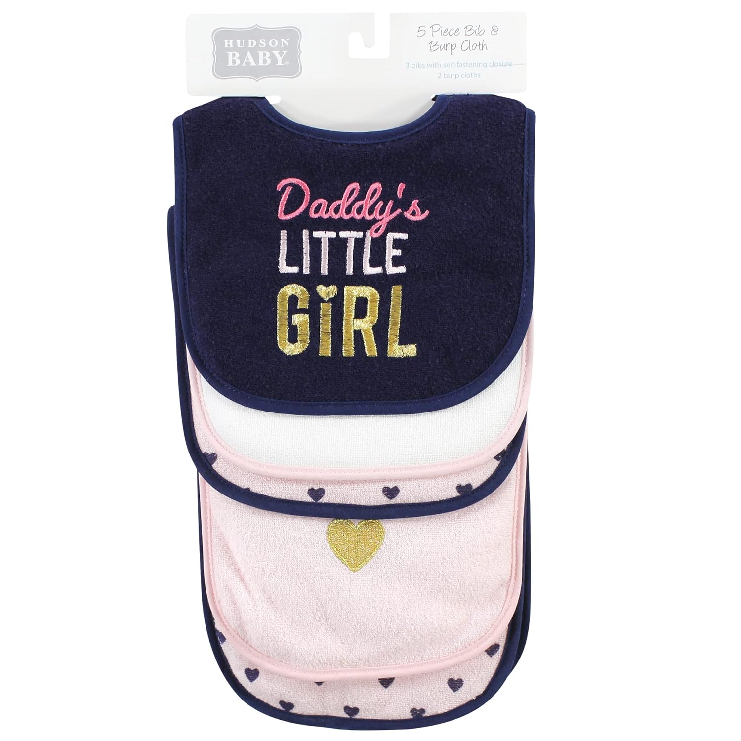 Set includes three bibs and two burp cloths