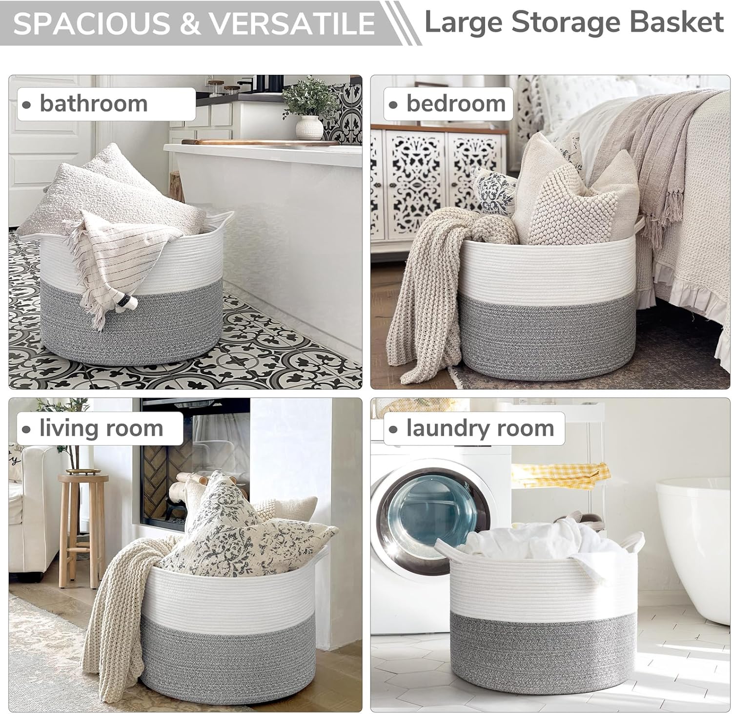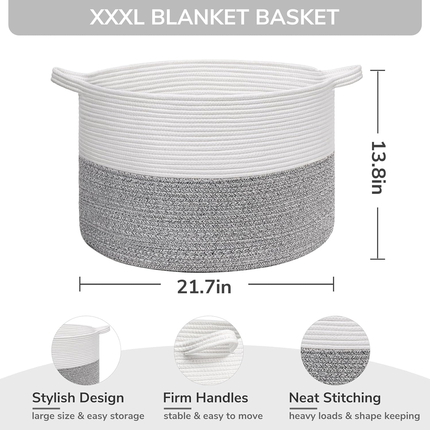 INDRESSME Large Storage Basket, 21.7” x 13.8” Cotton Rope Blanket Basket Living Room, Toy Organizers and Storage with Handles for Kids, Laundry Basket for Clothes, Towel, 90L Grey