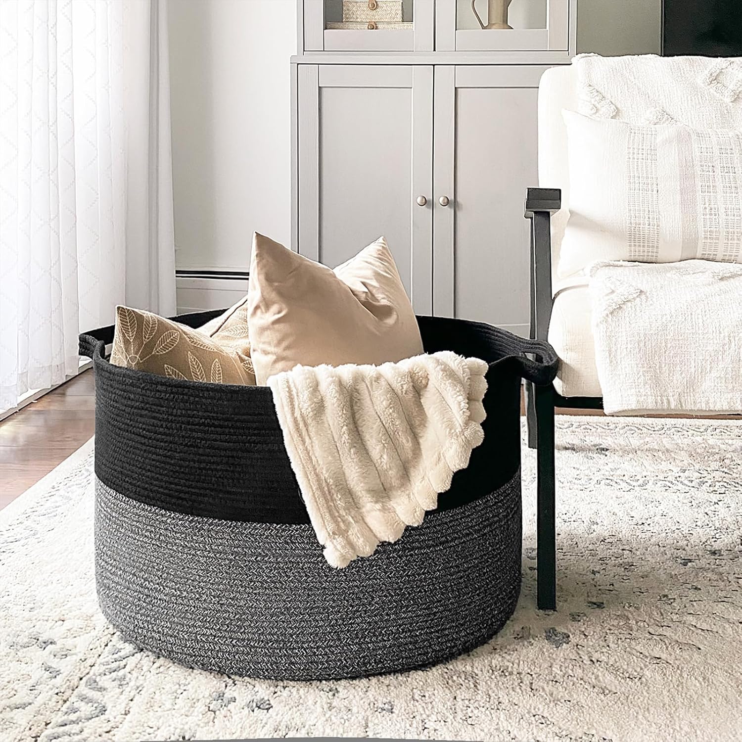 XXX Large size: 21.7″ x 21.7″ x 13.8″, which is a perfect storage basket in living room for blankets, throw pillows, comforter or cushions