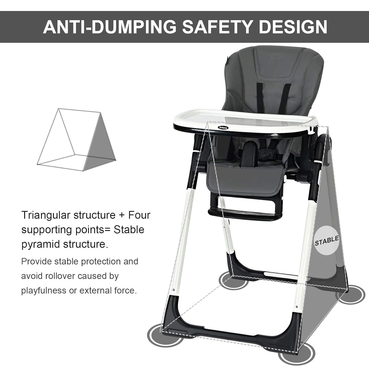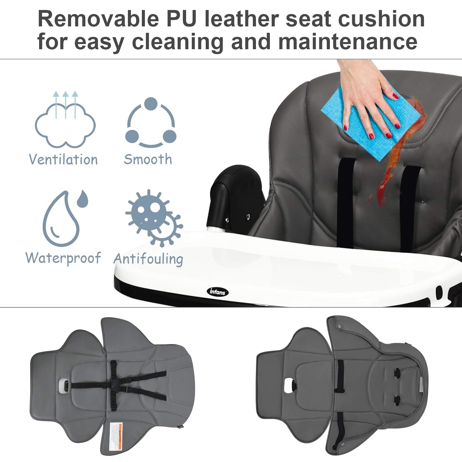EASY TO CLEAN WITH DETACHABLE DESIGN: Cleanliness has always been a top concern for baby products. Contact with detachable trays and seat cushion, our baby high chair is easy to clean and maintain after daily use. The removable PP top tray is also dishwasher safe. And the PU leather cushion is waterproof that you just need to wipe the smudges with a clean cloth. 5-point safety harness ensures security for your little baby. All the corners of our baby highchair are smooth without sharp edges.
