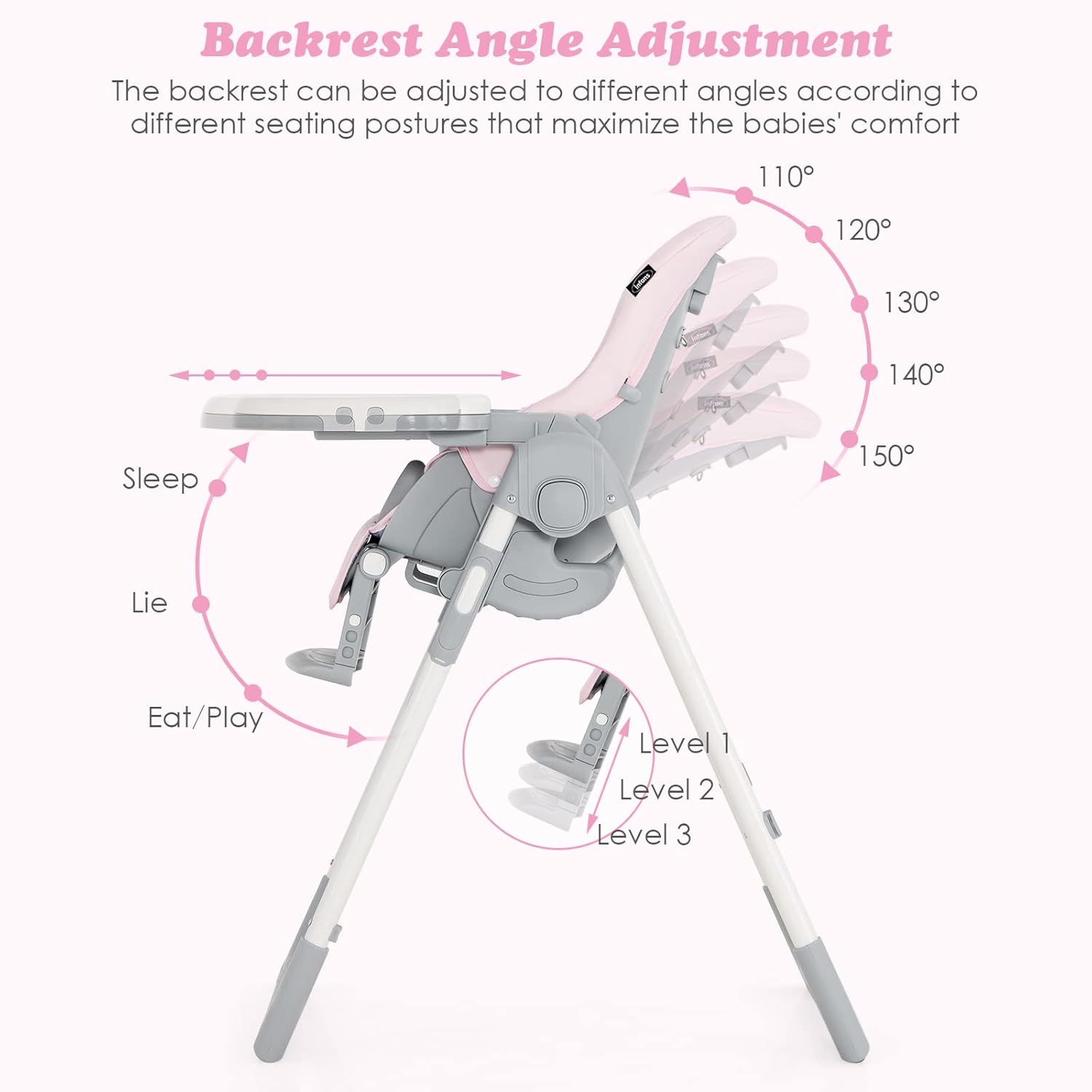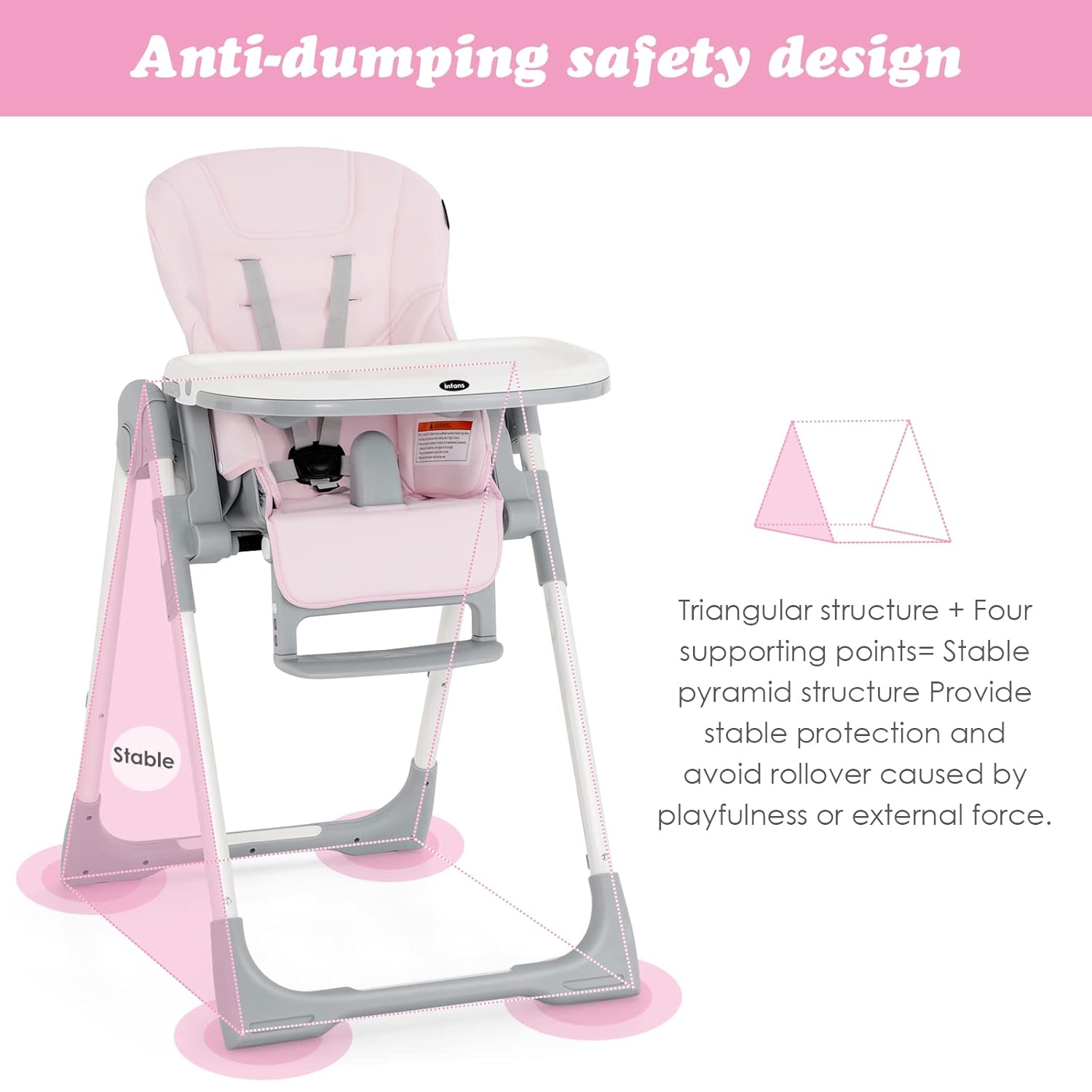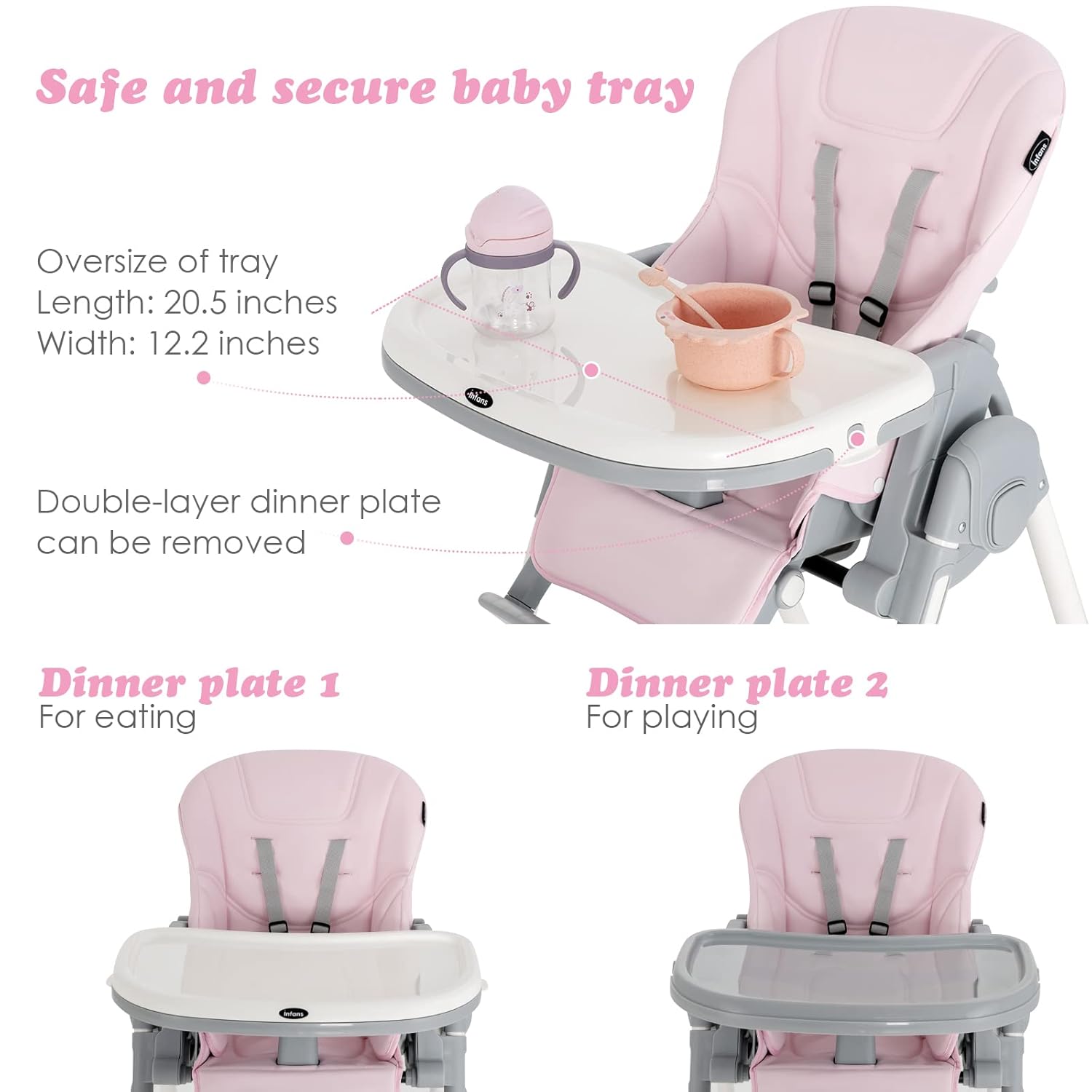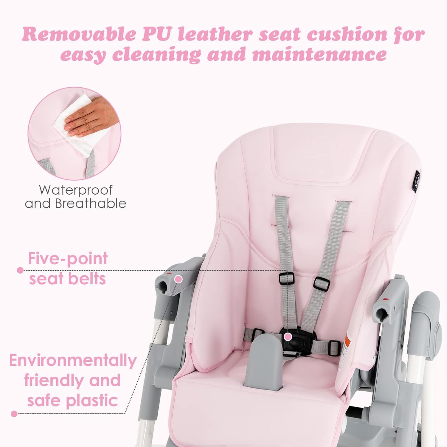 INFANS High Chair for Babies & Toddlers, Foldable Highchair with Multiple Adjustable Backrest, Footrest and Seat Height, Removable Tray, Detachable PU Leather Cushion, Built-in Rear Wheels (Pink)
