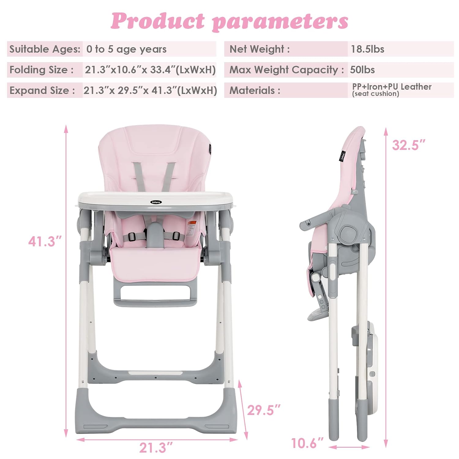 EASY TO CLEAN WITH DETACHABLE DESIGN: Cleanliness has always been a top concern for baby products. Contact with detachable trays and seat cushion, our baby high chair is easy to clean and maintain after daily use. The removable PP top tray is also dishwasher safe. And the PU leather cushion is waterproof that you just need to wipe the smudges with a clean cloth. 5-point safety harness ensures security for your little baby. All the corners of our baby highchair are smooth without sharp edges.