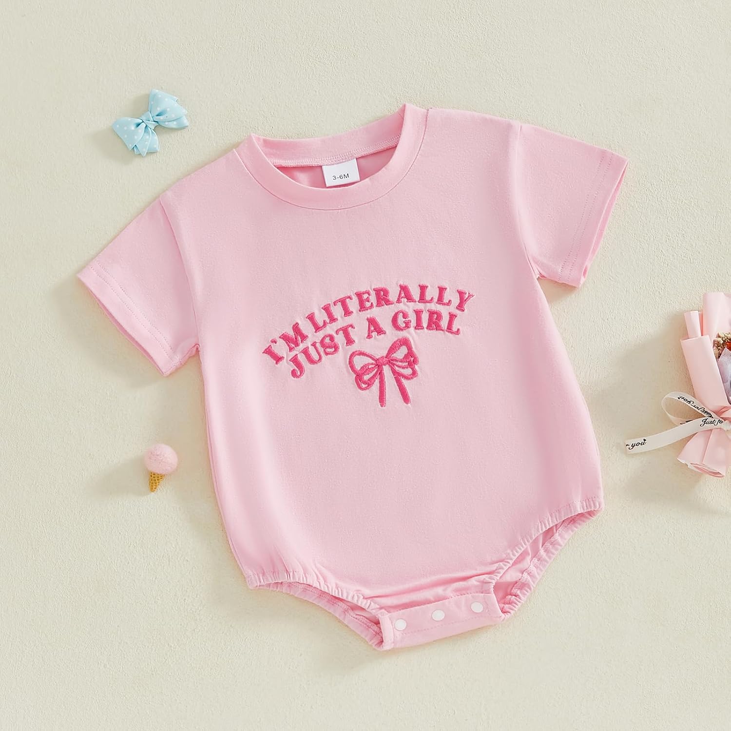 Baby Girls T-Shirt Romper Letter Bow Embroidery Short Sleeve Round Neck Summer Adorable Jumpsuit